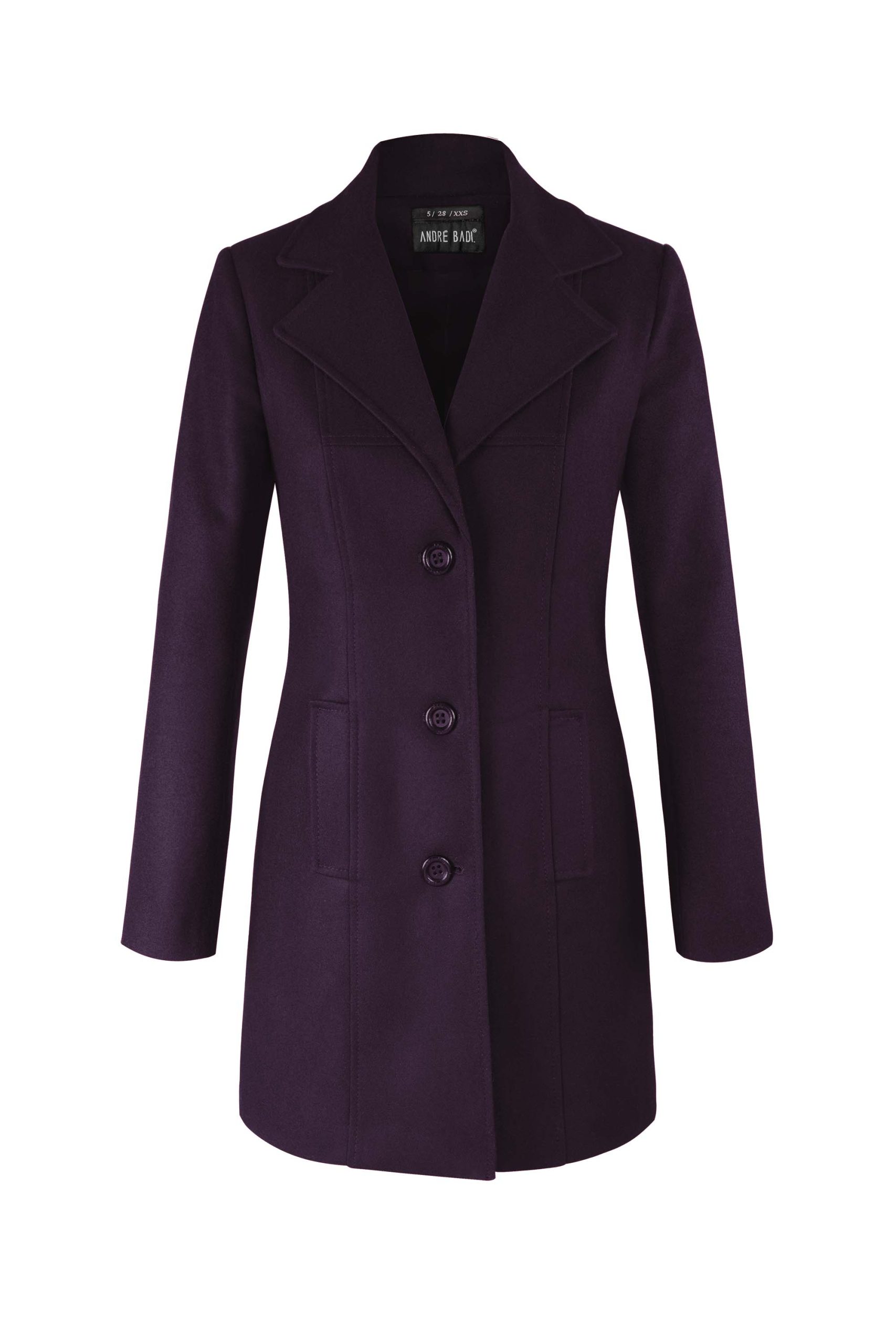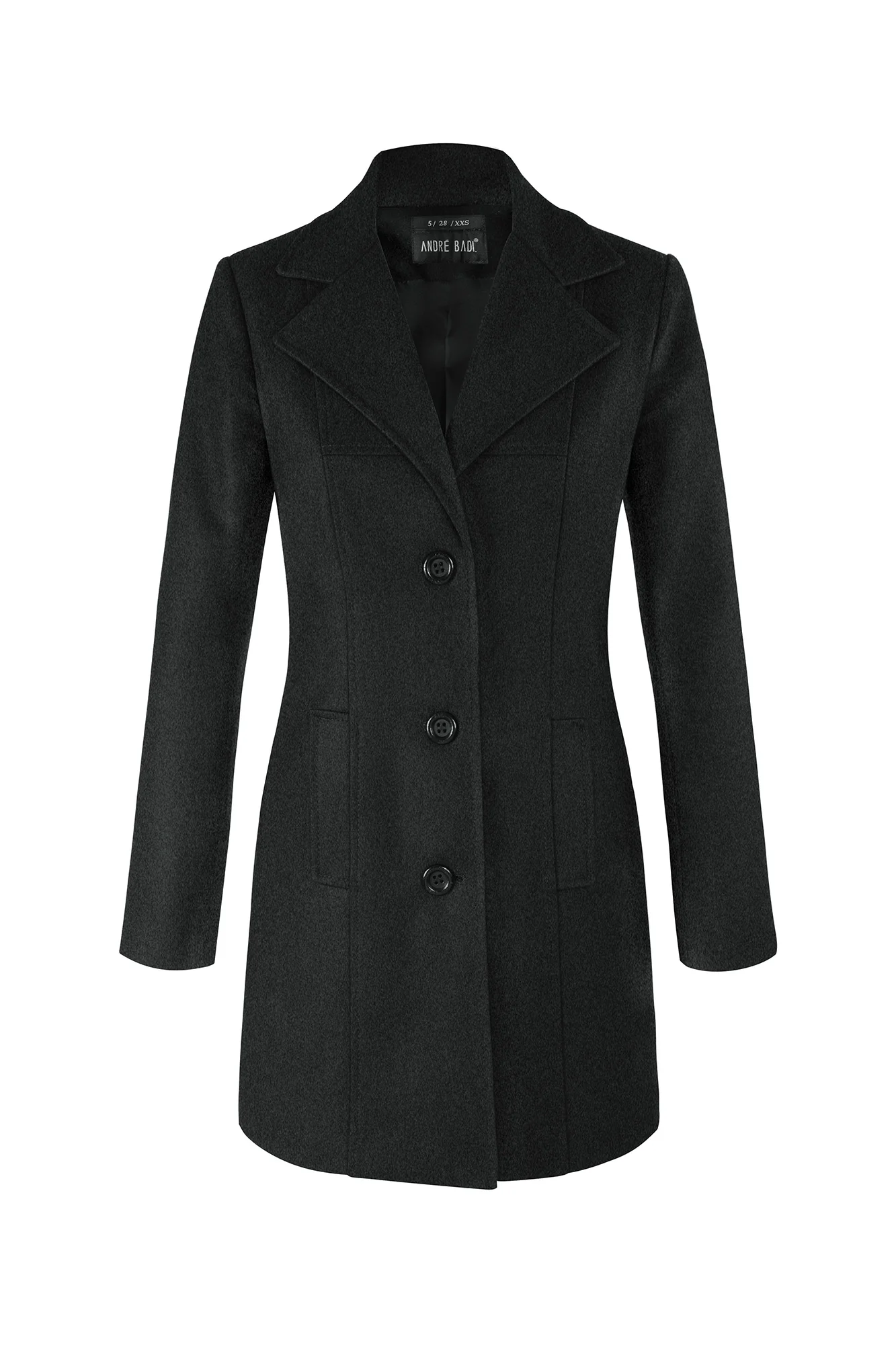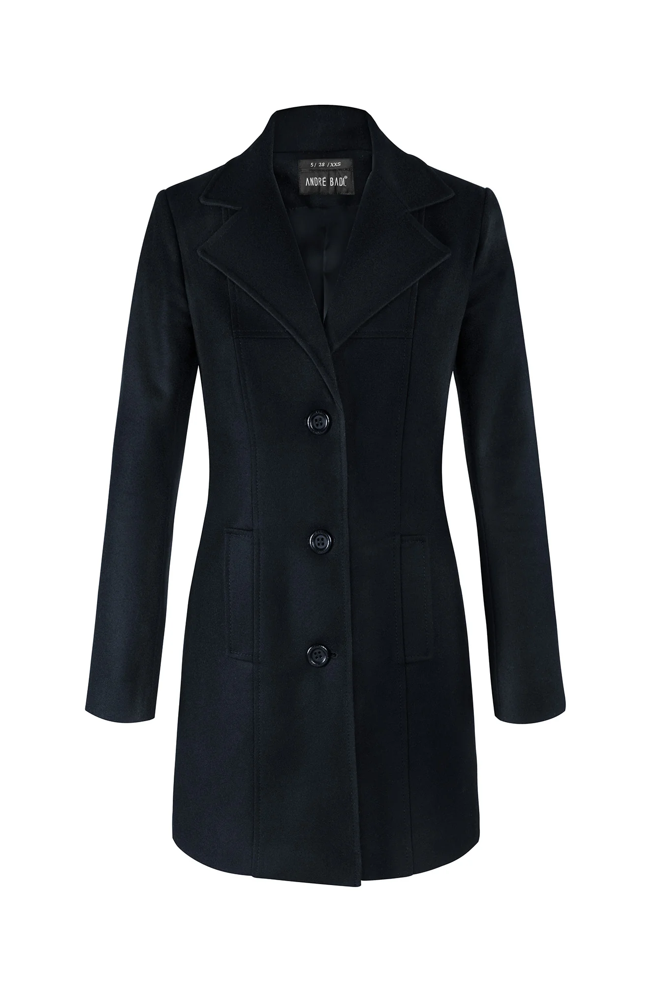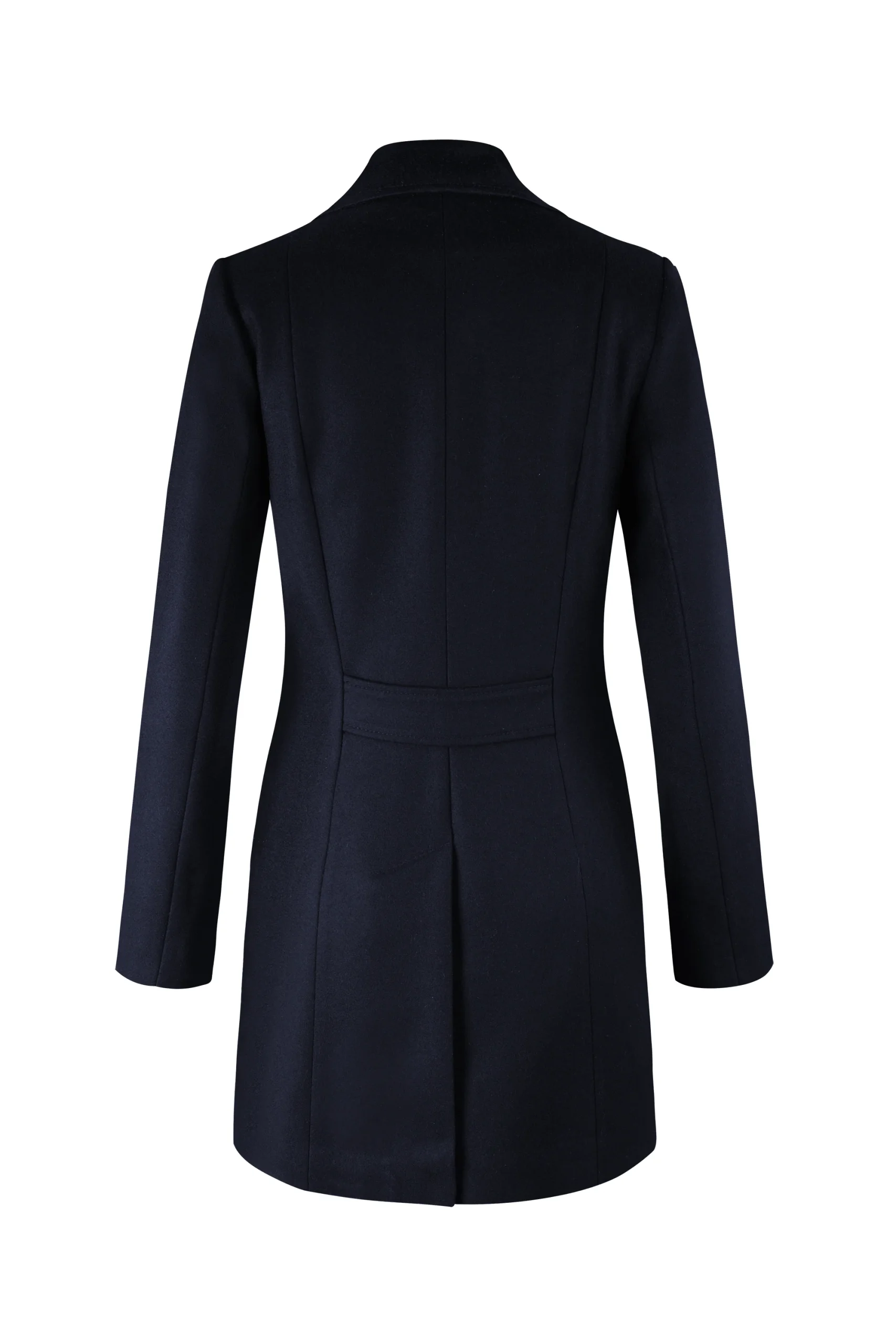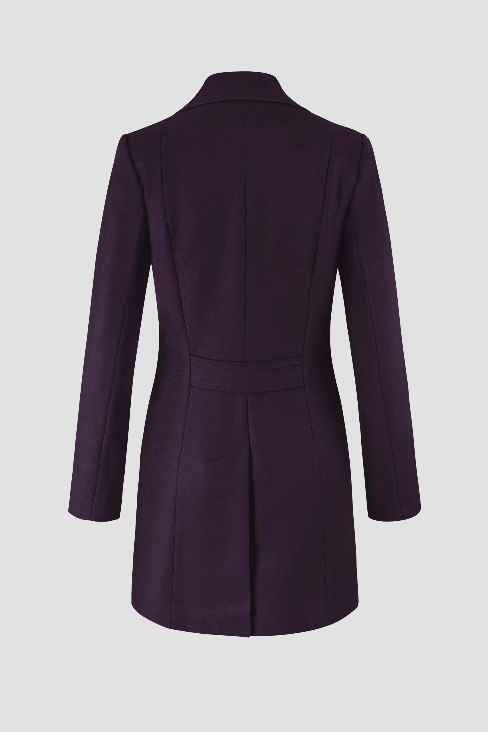 - Abrigo de lana delgada con cortes centrales y bolsillos verticales.