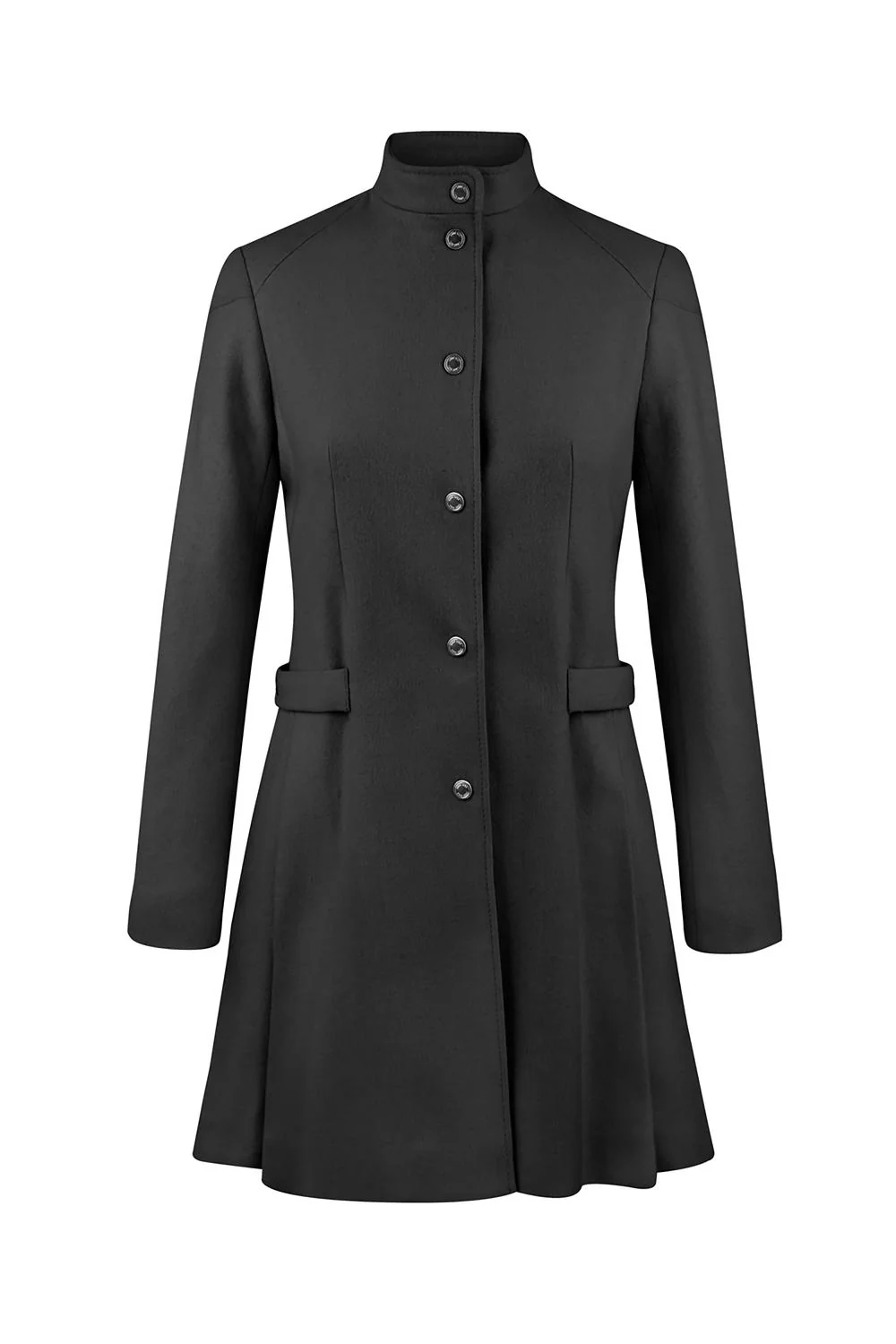 Abrigo de lana delgada con cuello mao, corte en hombros, cinto en costados y botones metálicos. prod. # 01-0157