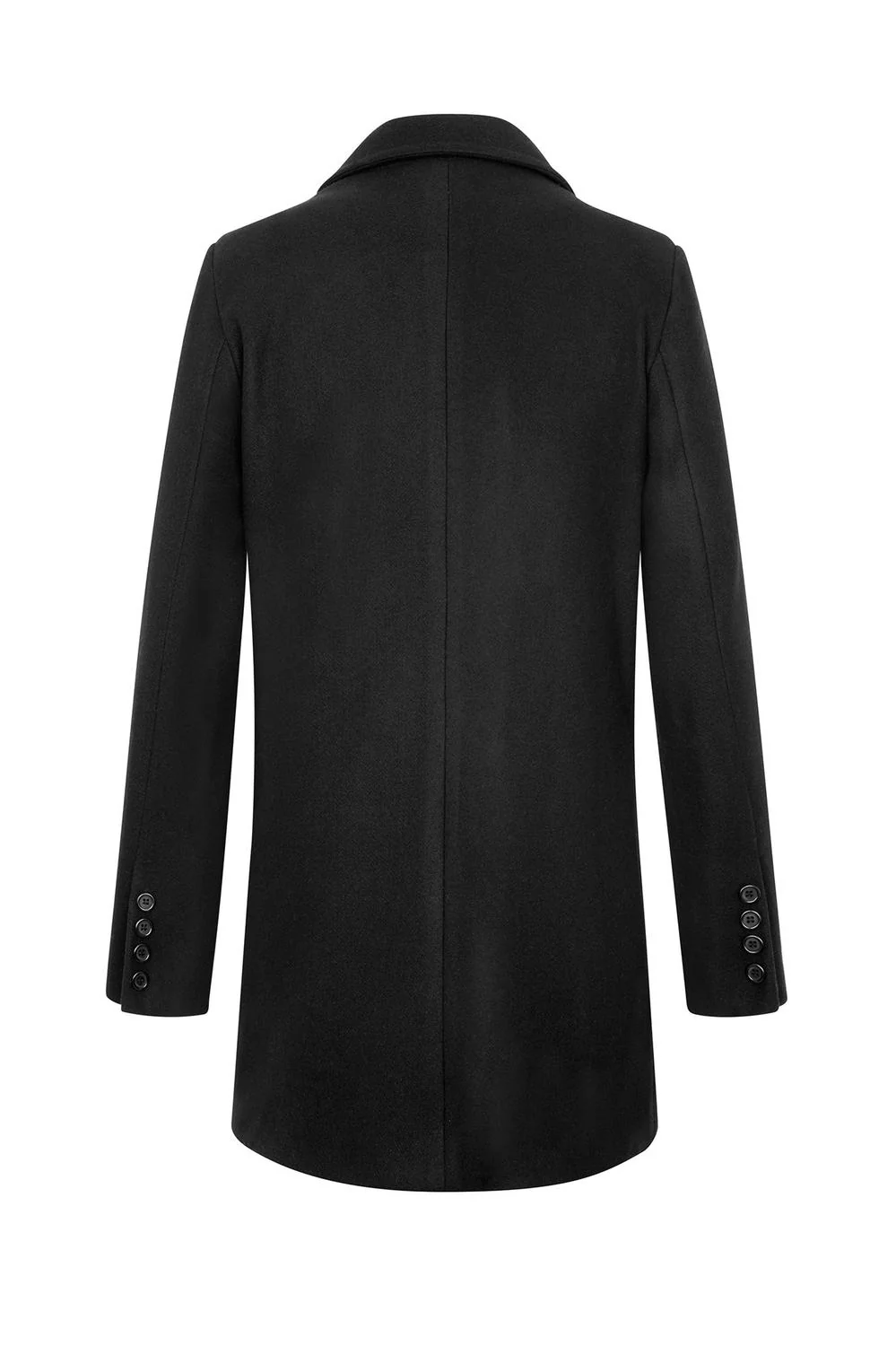 - Abrigo con cuello, solapa ancha, cierre frontal cruzado, botonadura y múltiples bolsillos.