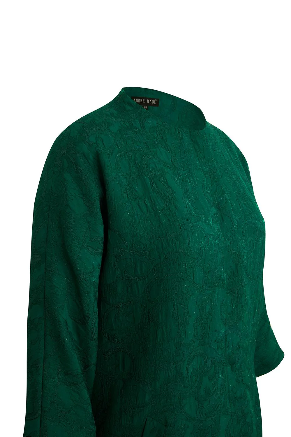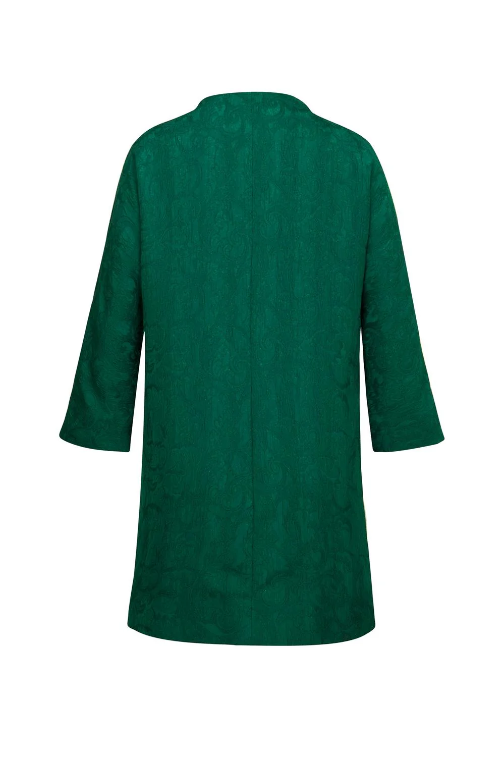 - Abrigo con textura, cuello redondo, botonadura frontal, simulación de bolsillos y mangas 3/4 continuas.
