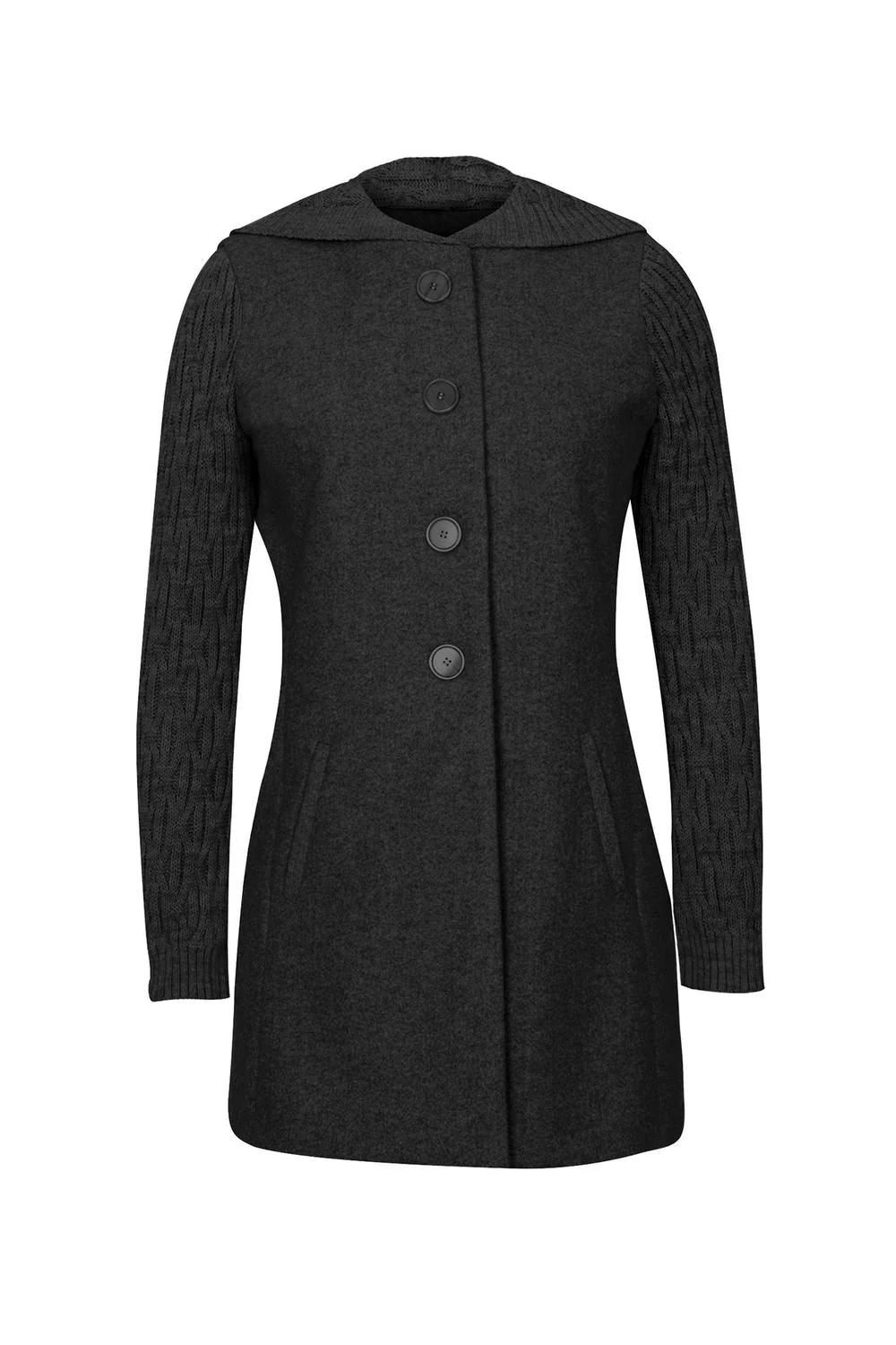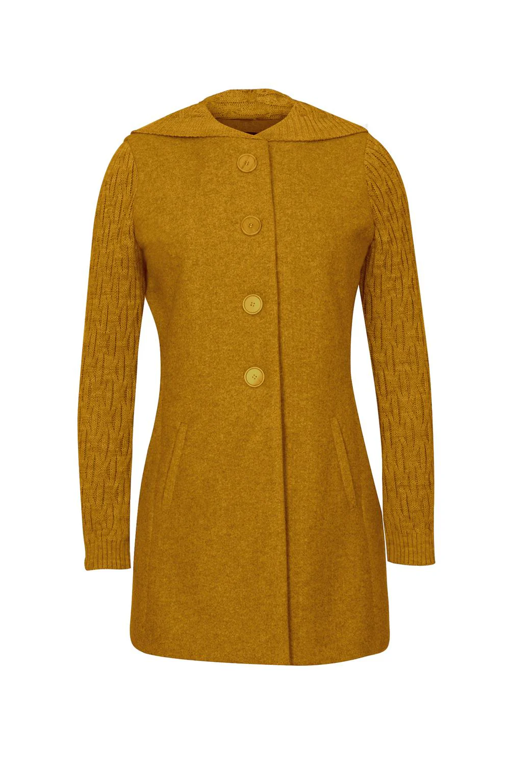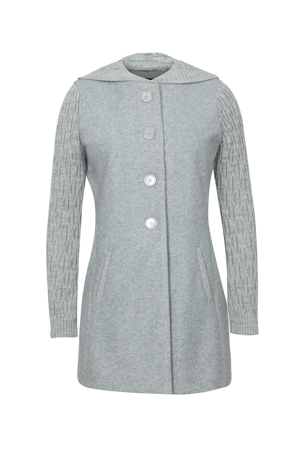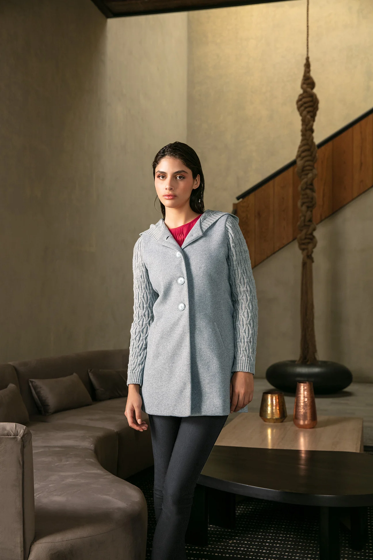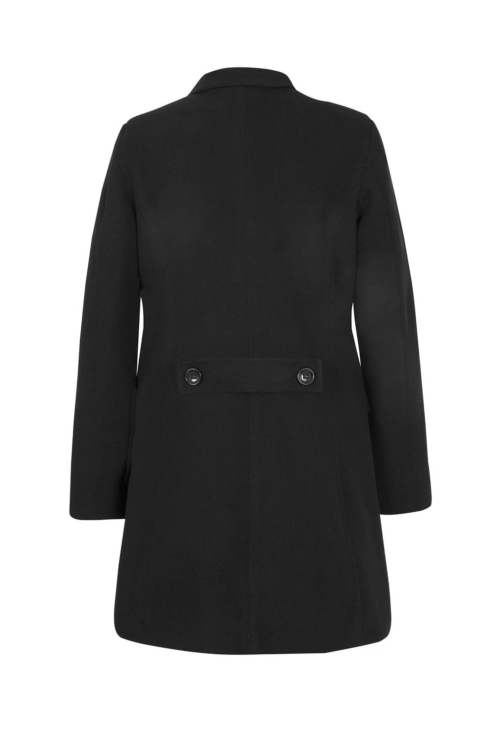 - Abrigo con cuello alto, cierre metálico oculto, cortes frontales, bolsillos en laterales, mangas largas, fajo decorativo en puños, lazo en cintura y ruedo en línea «A».