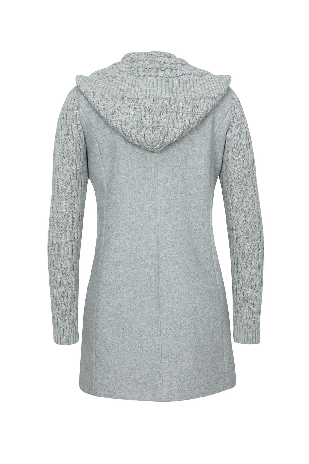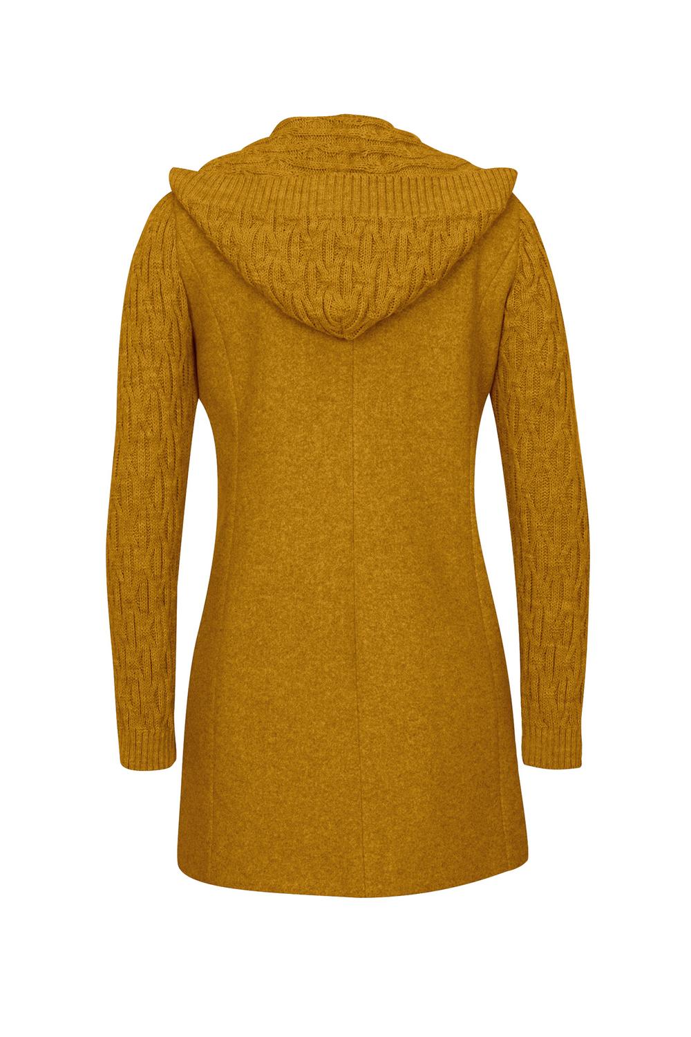 Abrigo con cuello alto, cierre metálico oculto, cortes frontales, bolsillos en laterales, mangas largas, fajo decorativo en puños, lazo en cintura y ruedo en línea «A». 01-2503