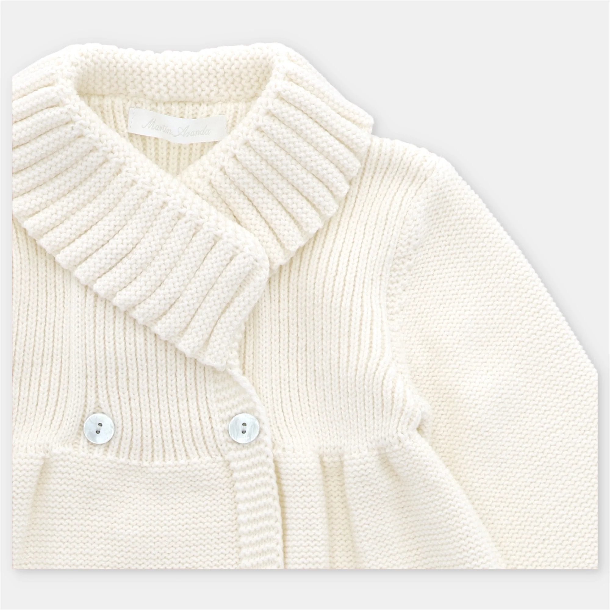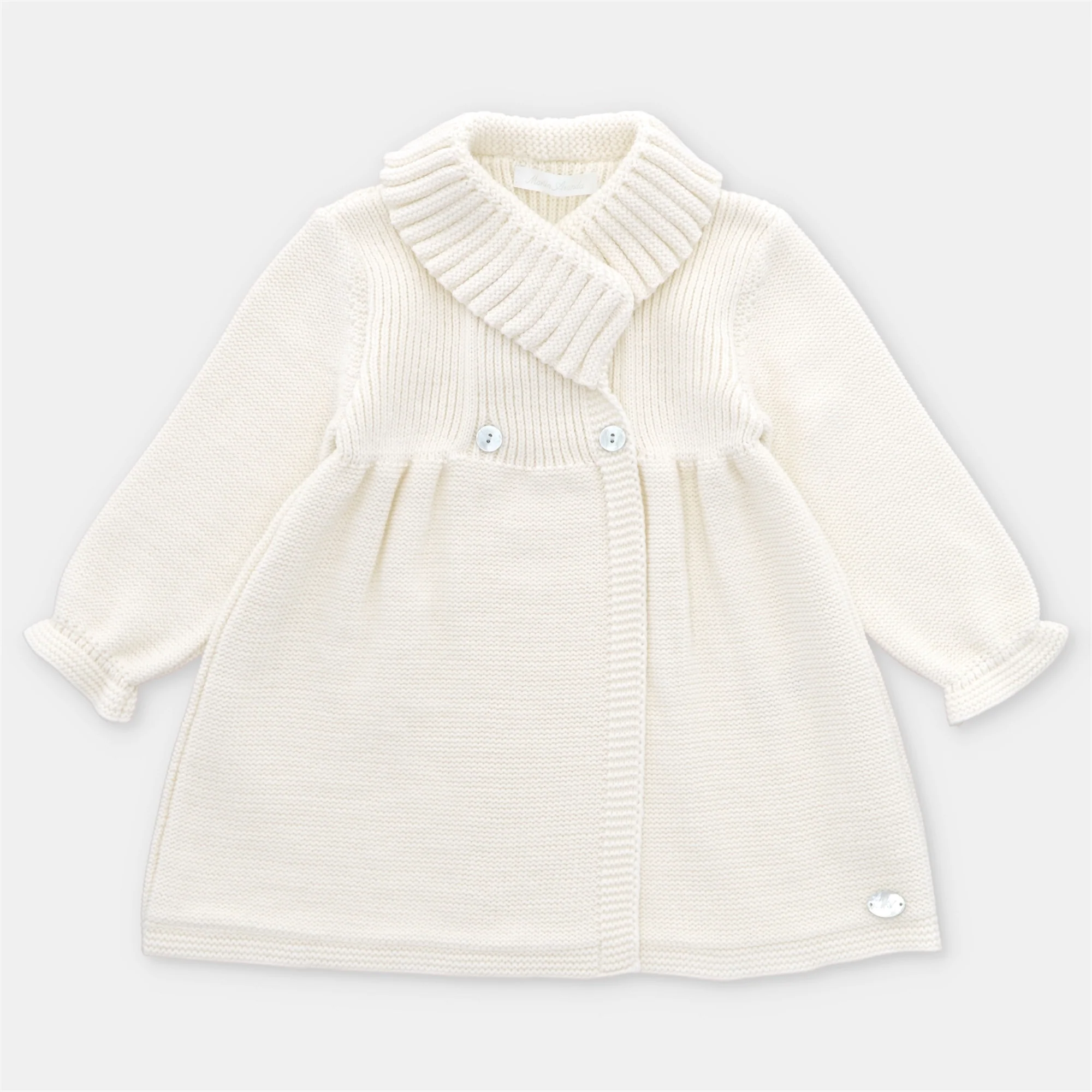 Abrigo de cuello redondo con dobles, manga larga, cierre cruzado con botones, hermosos detalles de punto tejido con relieve y de color liso.