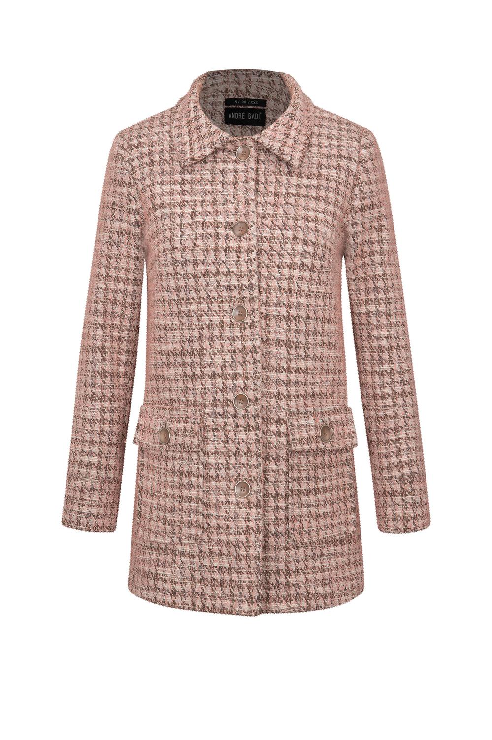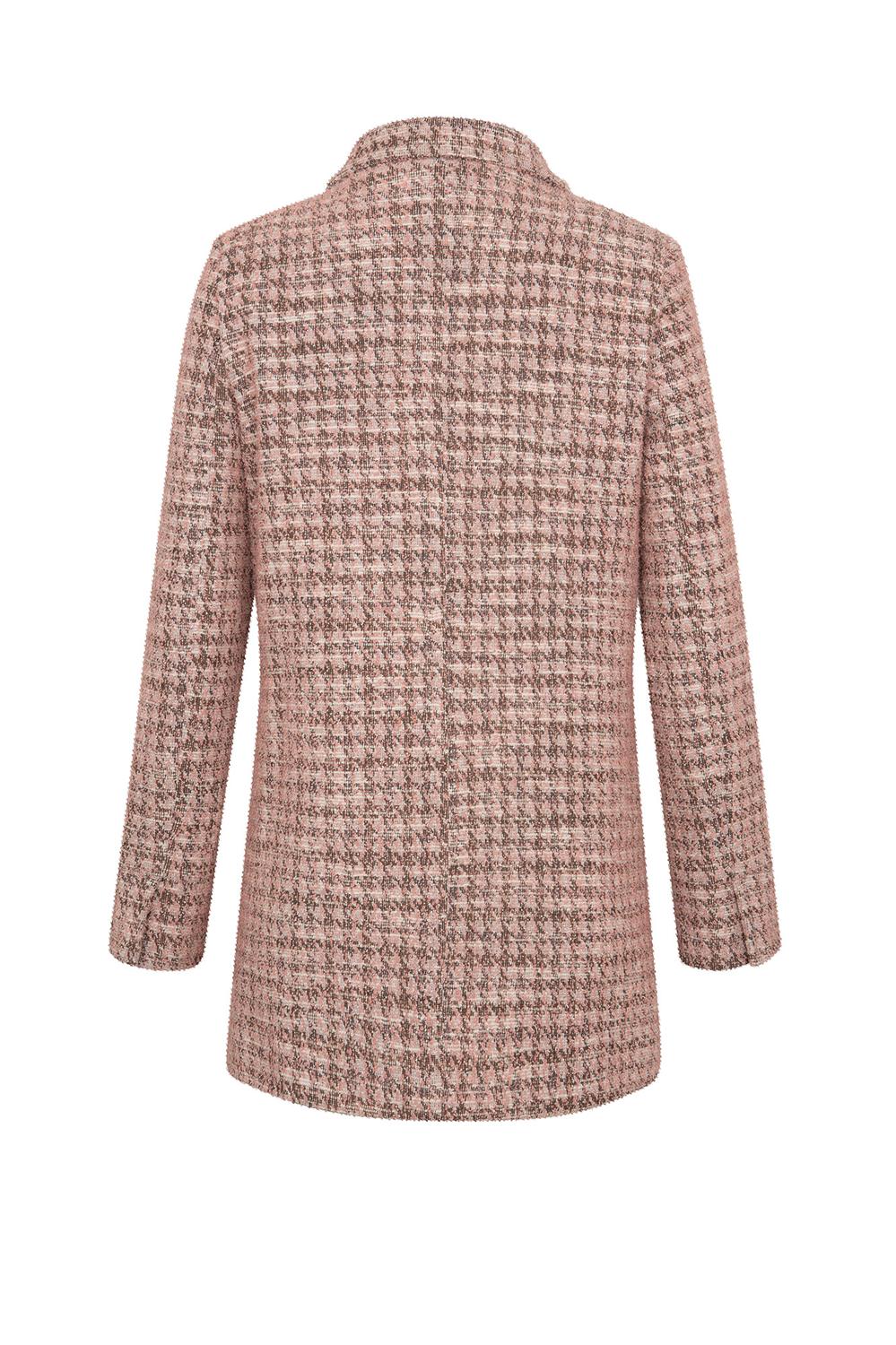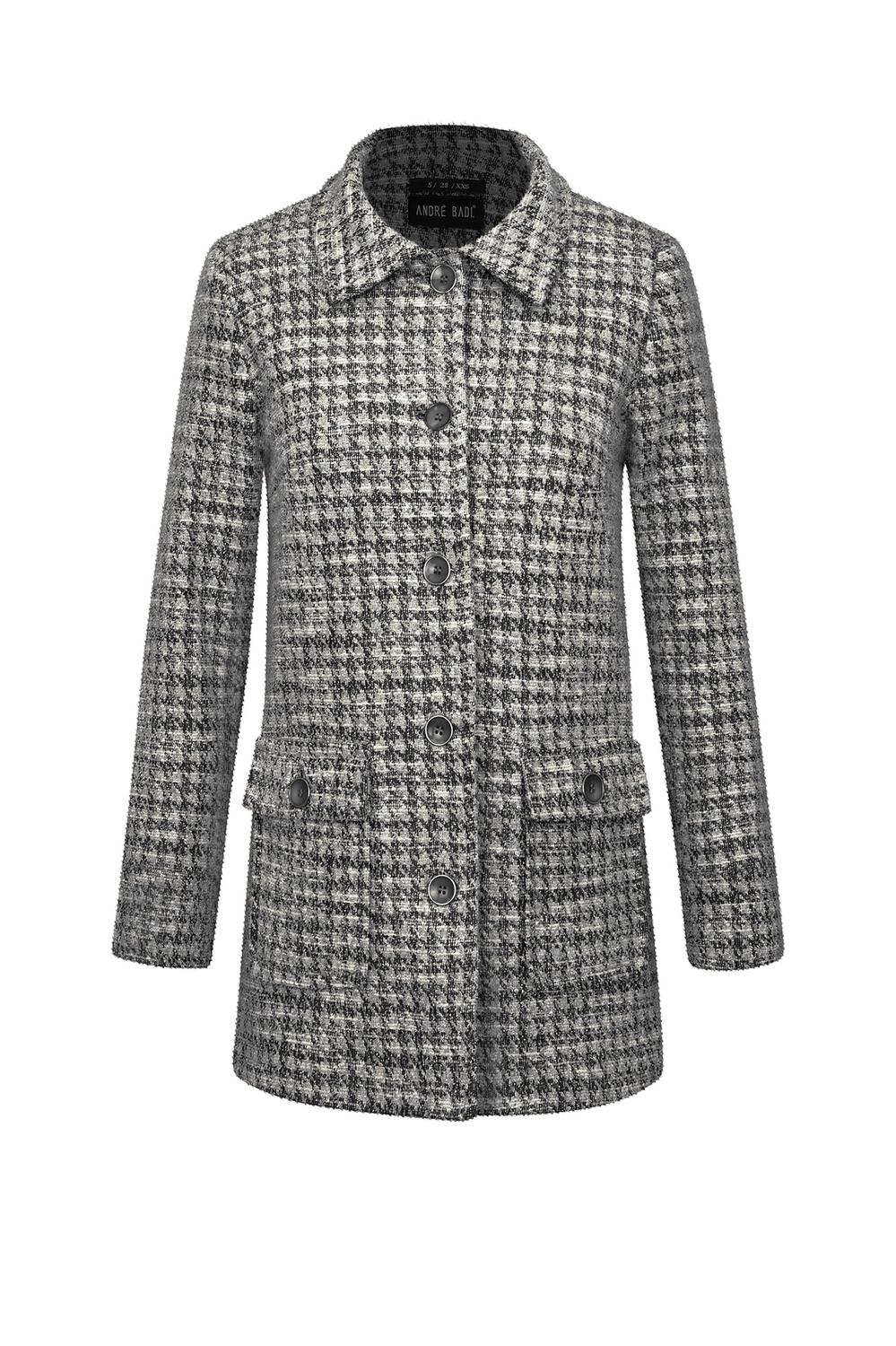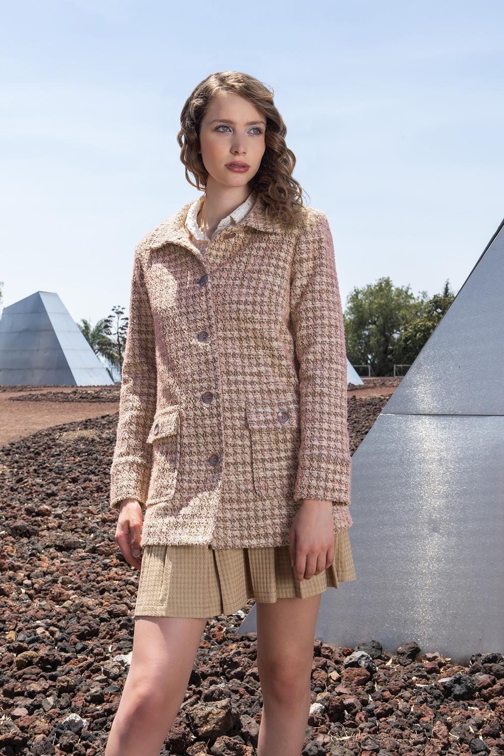- Abrigo largo 3/4 con cuello, botonadura frontal, bolsillos tipo parche, mangas largas y puños anchos.