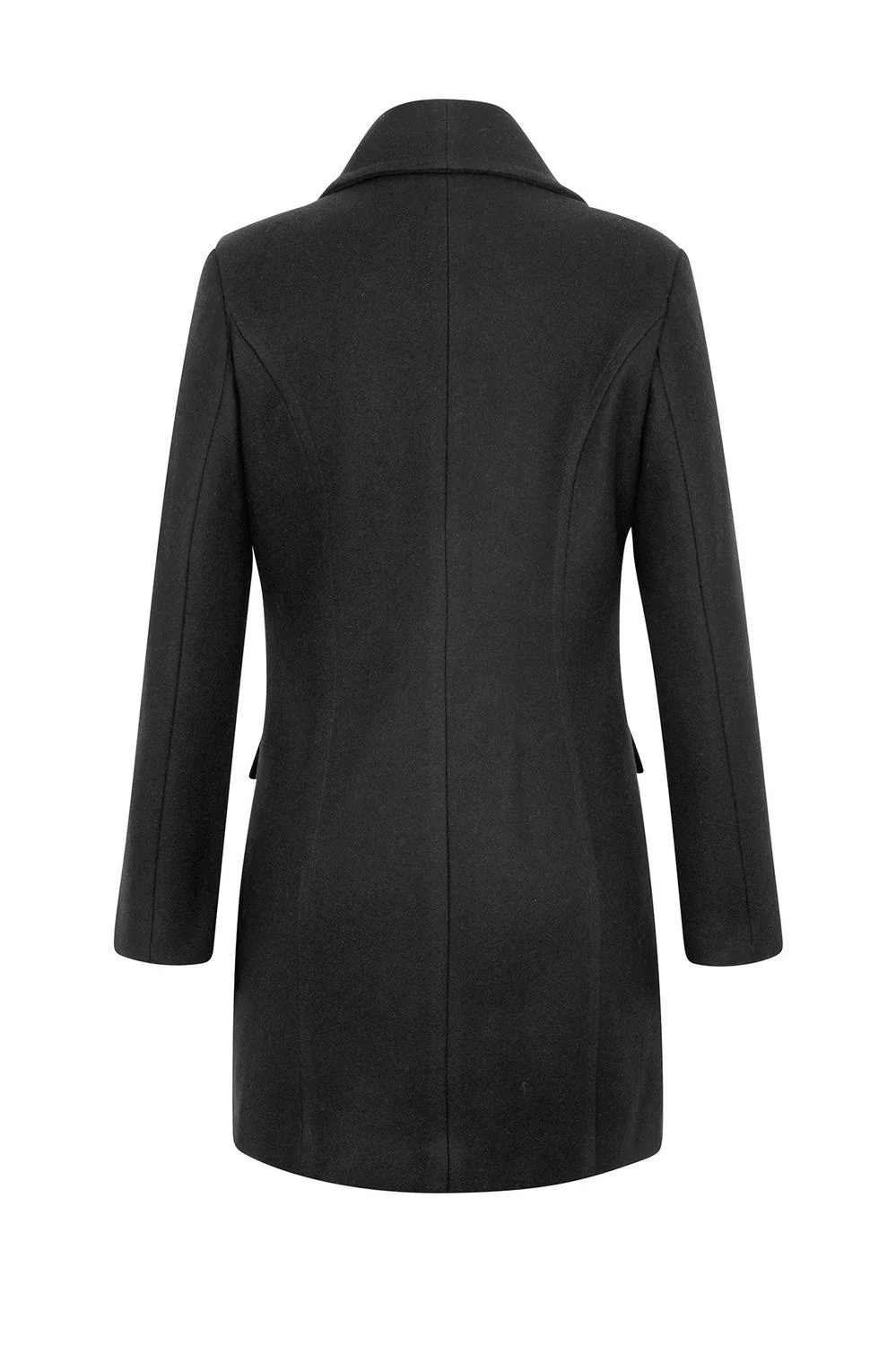 Abrigo largo 3/4 con solapa, cierre frontal cruzado, botonadura, cierres decorativos y bolsillos en costados.