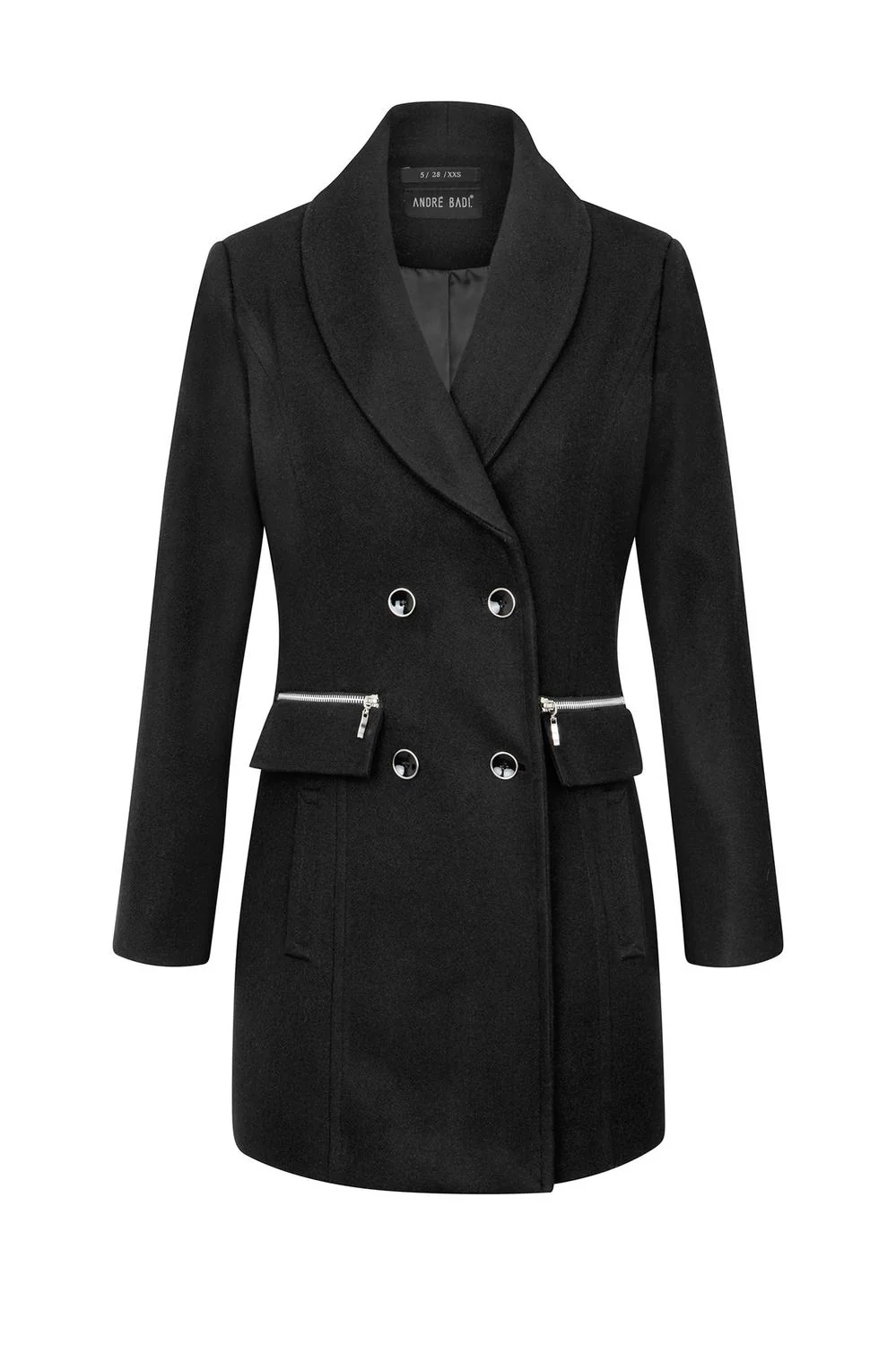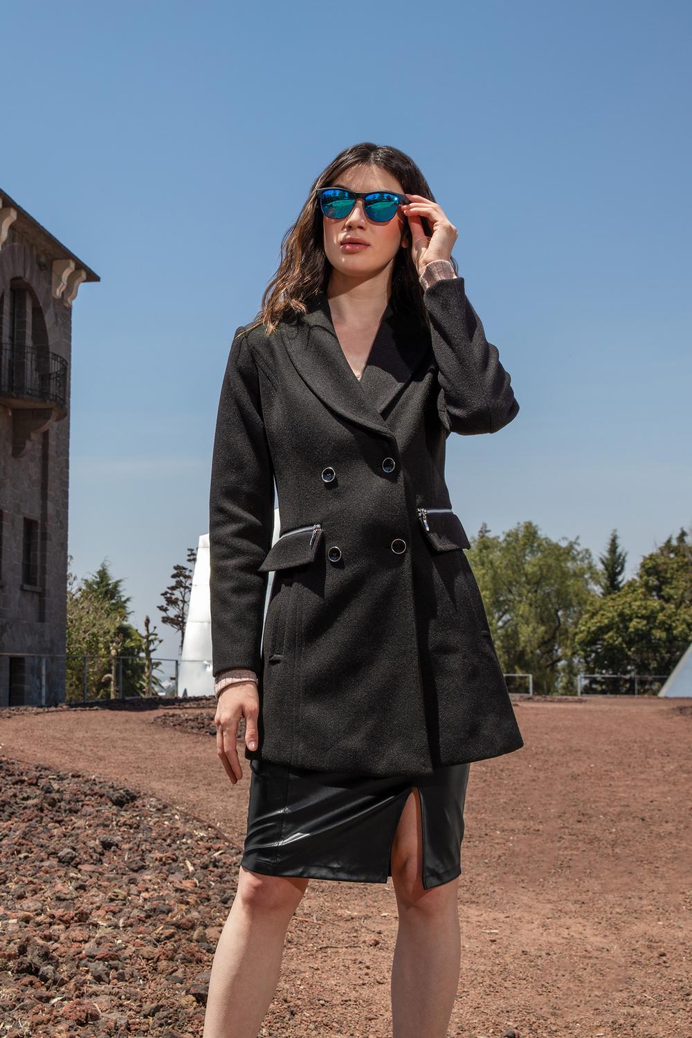- Abrigo largo 3/4 con solapa, cierre frontal cruzado, botonadura, cierres decorativos y bolsillos en costados.