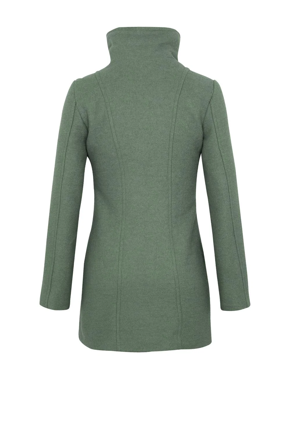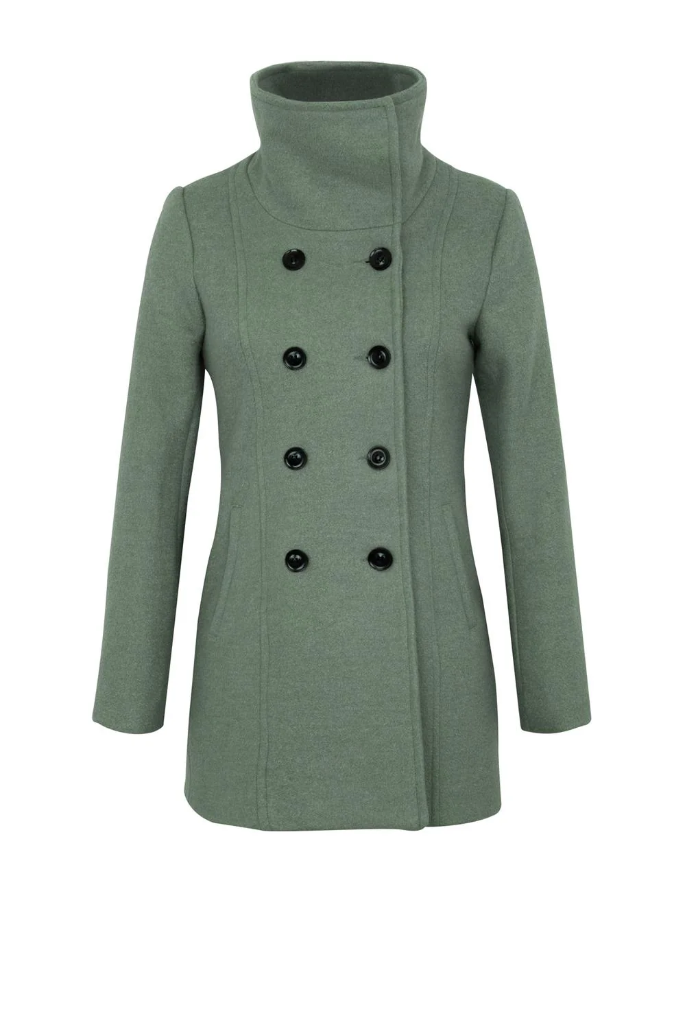 • Abrigo con cuello alto, botonadura doble frontal, bolsillos laterales, cortes decorativos y mangas largas.