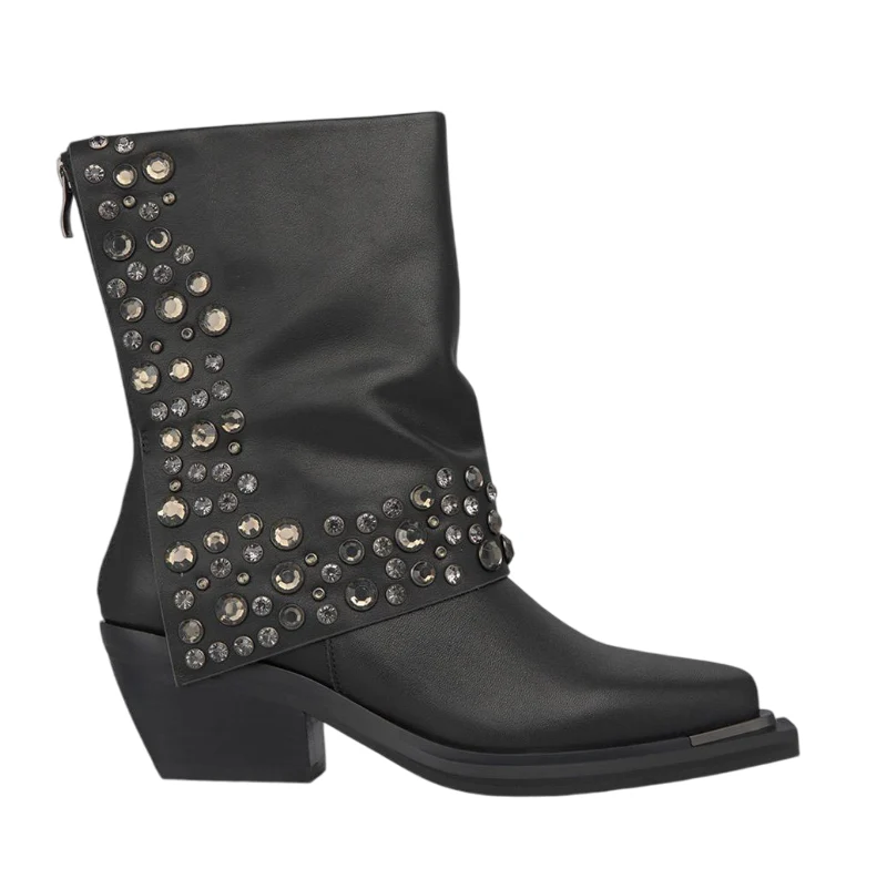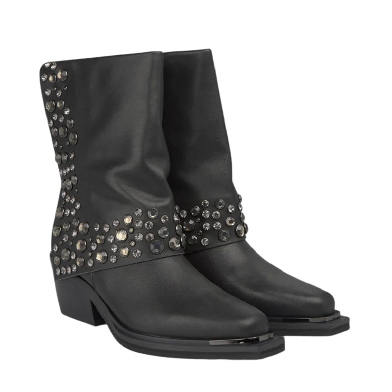 Botín de mujer con caña plegada y tachas en el pliegue, realizado en piel.