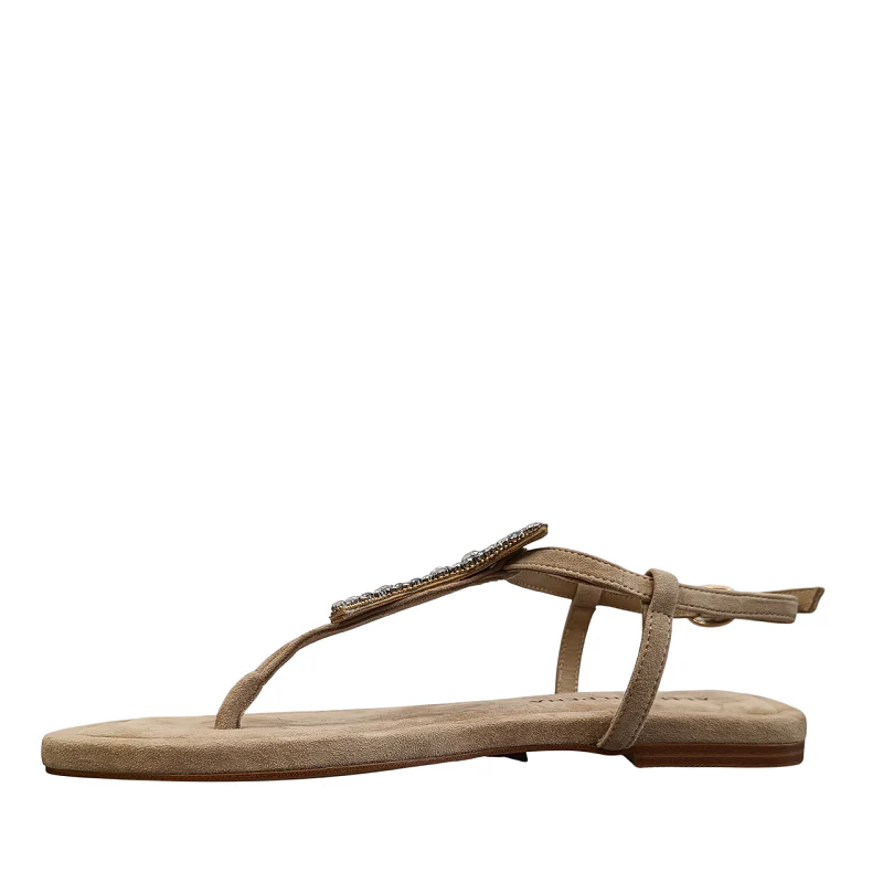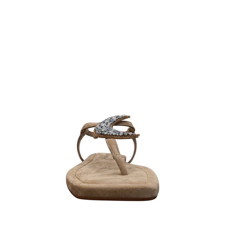 Estas sandalias de mujer Alma En Pena modelo V251984 en color beige están confeccionadas en piel ante de alta calidad. Destacan por su detalle único: una luna decorada con gemas azules que simulan un mosaico, aportando un toque sofisticado y original. Ideales para fiestas, ceremonias o salidas informales en la playa o con amigas, combinan estilo y comodidad para cualquier ocasión especial.