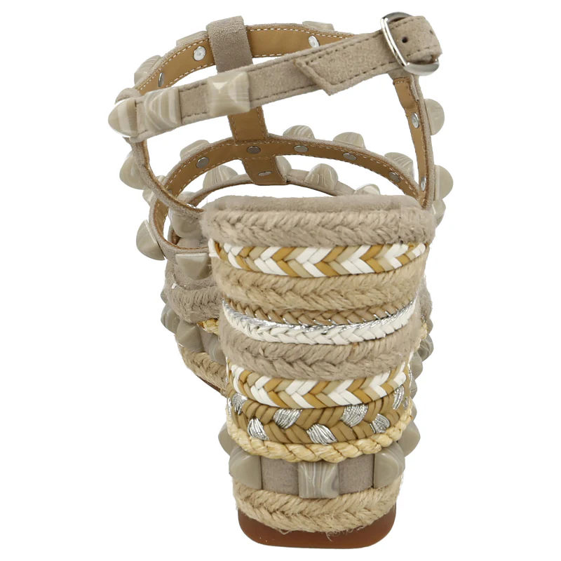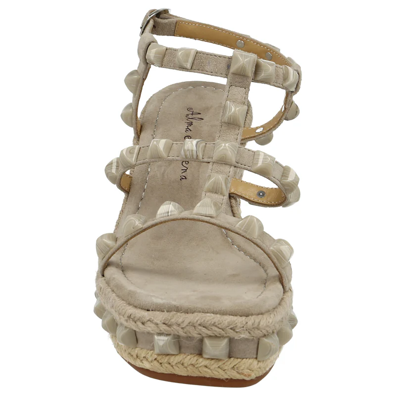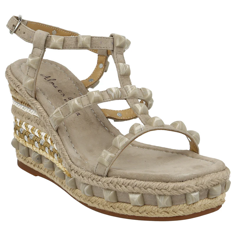 Sandalía de la marca ALMA EN PENA modelo V23451 SUEDE en color TAUPE. Sandalia cuña de piel con detalle trenzado y de pedrería. Punta cuadrada. Cierre con sibilla en tobillo y altura de tacón de 9,5cm