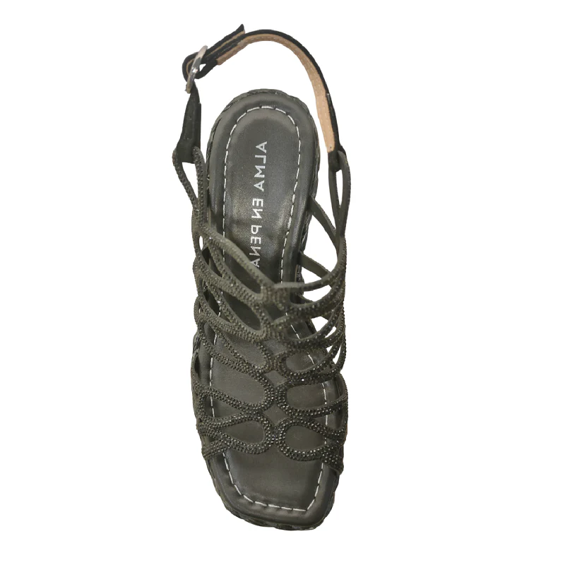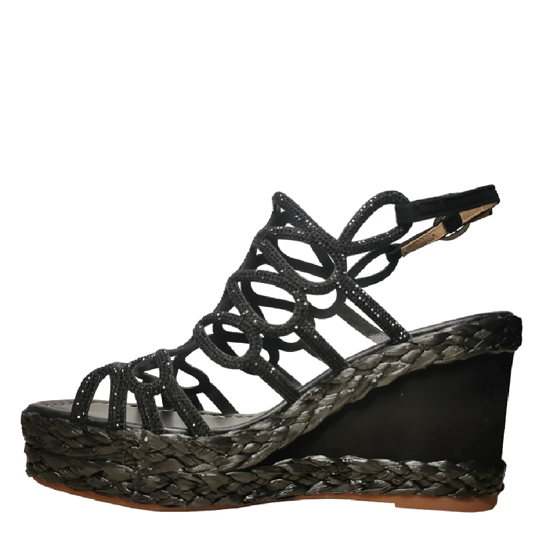 Sandalia de mujer de la marca alma en pena en color negro con cuña trenzada y con detalle de pedrería. Puntera cuadrada, suela acolchada y cierre con hebilla en el tobillo para una mayor comodidad.