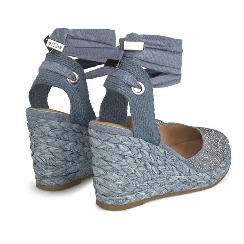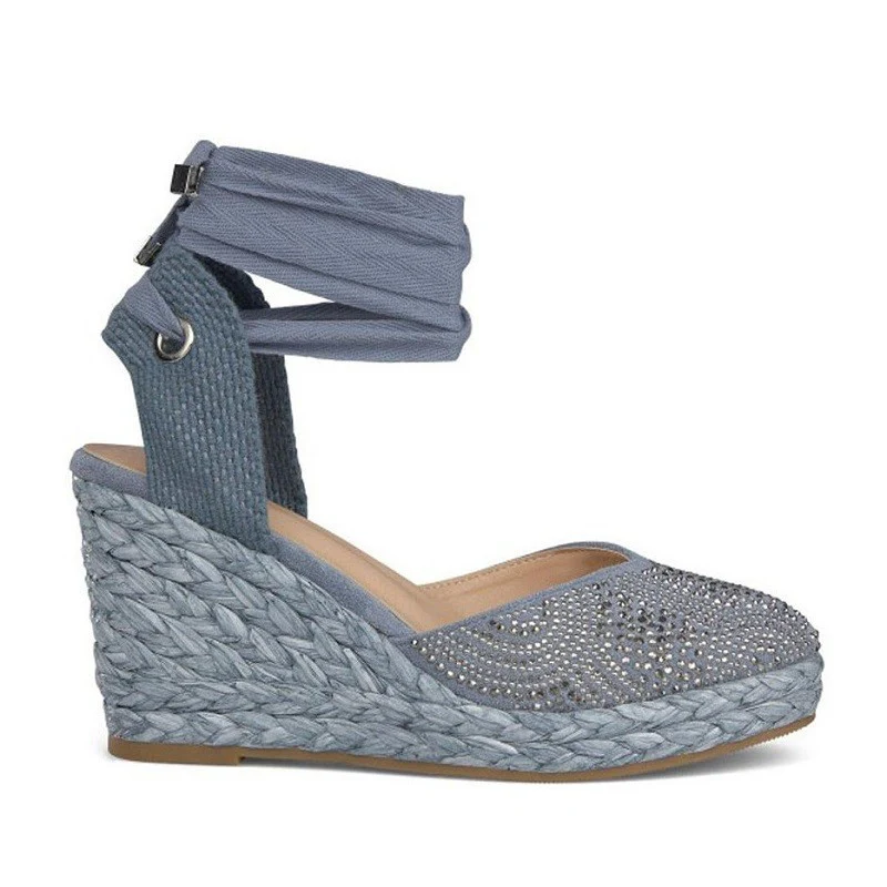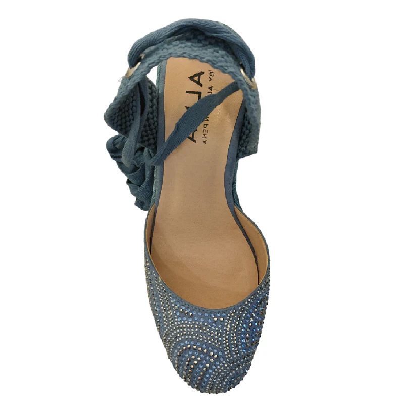 Alpargatas para mujer Alma en Pena en color azul, cerrada de la punta y con brillantes son la combinación perfecta de estilo casual y elegante. Con una cuña de unos 8 cm, estas alpargatas son ideales para cualquier ocasión. Con tiras para atar al tobillo y puntera cerrada, lucirás una imagen actual y moderna este verano sin sacrificar la comodidad.