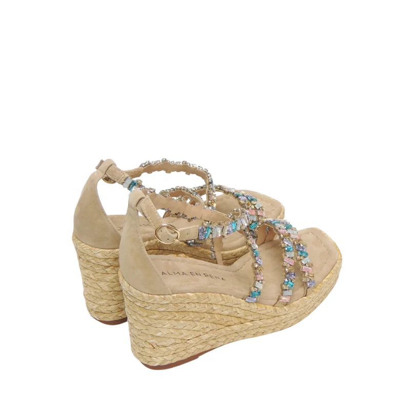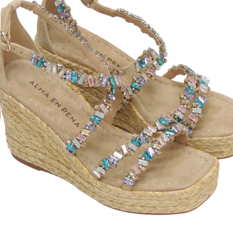 Las sandalias Alma en Pena V251272 son un modelo elegante y sofisticado diseñado especialmente para ocasiones festivas. Están confeccionadas en ante con detalles brillantes tipo bijou en las tiras que aportan un toque glamoroso y femenino. Cuentan con una cuña de casi 10 cm y una plataforma de 2 cm que garantizan altura y comodidad a la vez. El cierre con sibilla y el talón cerrado aseguran una buena sujeción, haciéndolas ideales para lucir durante horas en celebraciones eventos o noches especiales.