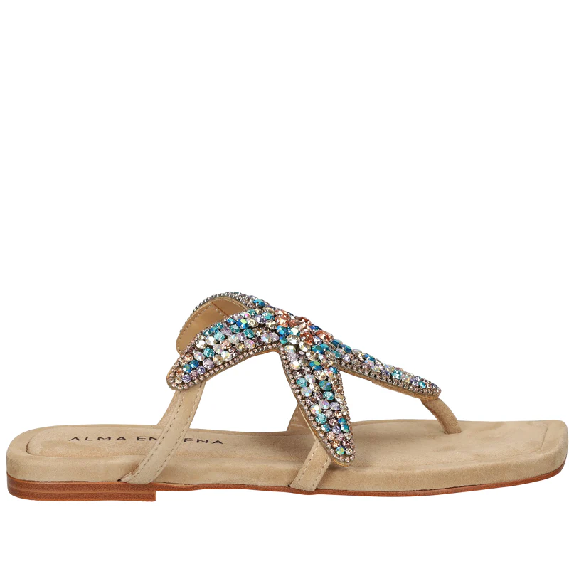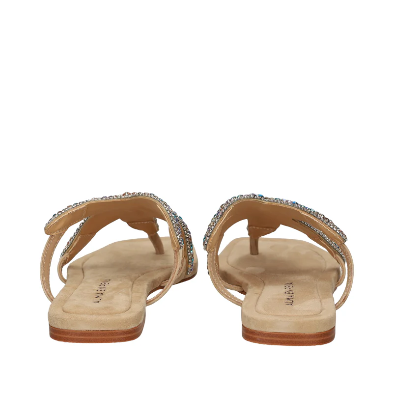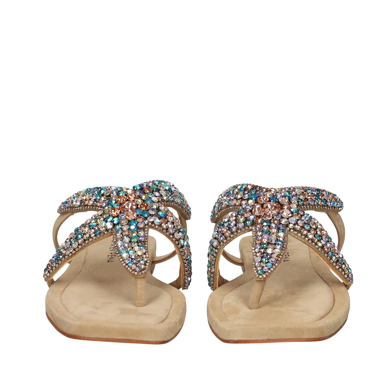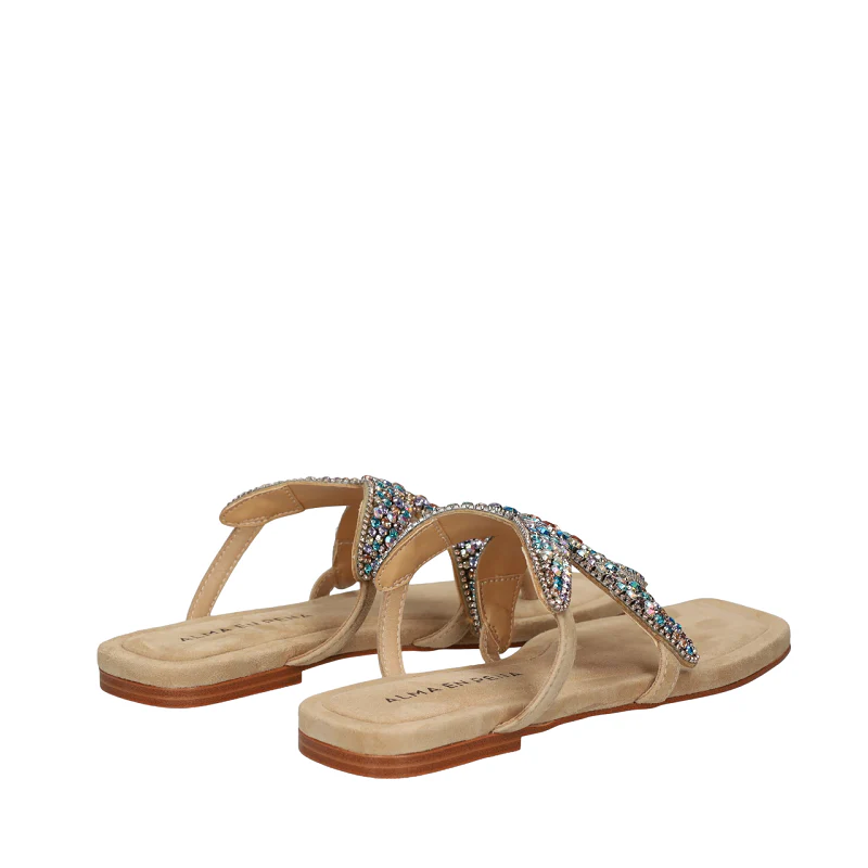 Sandalias planas femeninas y sofisticadas perfectas para un look veraniego y cómodo. Con puntera cuadrada y sin cierre tienen una discreta altura de 1cm de tacón que añade estabilidad sin renunciar a la elegancia. Están confeccionadas con exterior textil resistente e interior sintético ligero con una suela de fibra que las hace duraderas y ligeras. El adorno en forma de estrella —formado por pedrería o detalles brillantes— aporta un toque distintivo y llamativo modelando un diseño minimalista pero impactante. Son ideales para llevar con vestidos, pantalones cortos o combinados más frescos ofreciendo comodidad y estilo sin complicaciones al ponértelas ni durante caminatas prolongadas.