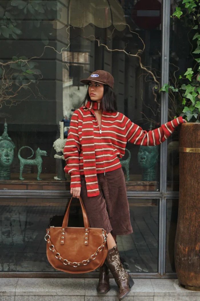 Bolso de piel de vacuno camel. Viene con un asa lisa de circulos que se puede acortar abriendo eslabones. Cuenta con 3 bolsillos internos de forro beige. Cabe hasta un ordenador de 15 pulgadas.