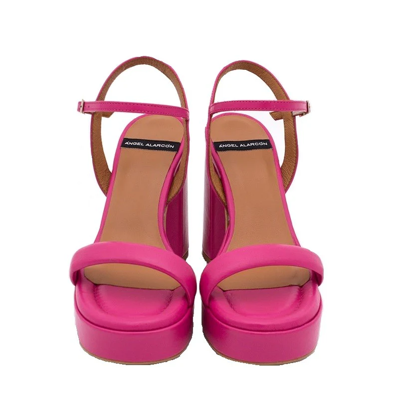 El modelo Mandy es una sandalia espectacular con tacón ancho alto (10 cm.) y plataforma delantera. Esta sujeta al tobillo y se ata con una hebilla. Tiene una tira delantera fina y elegante con una terminación en la parte delantera redondeada.