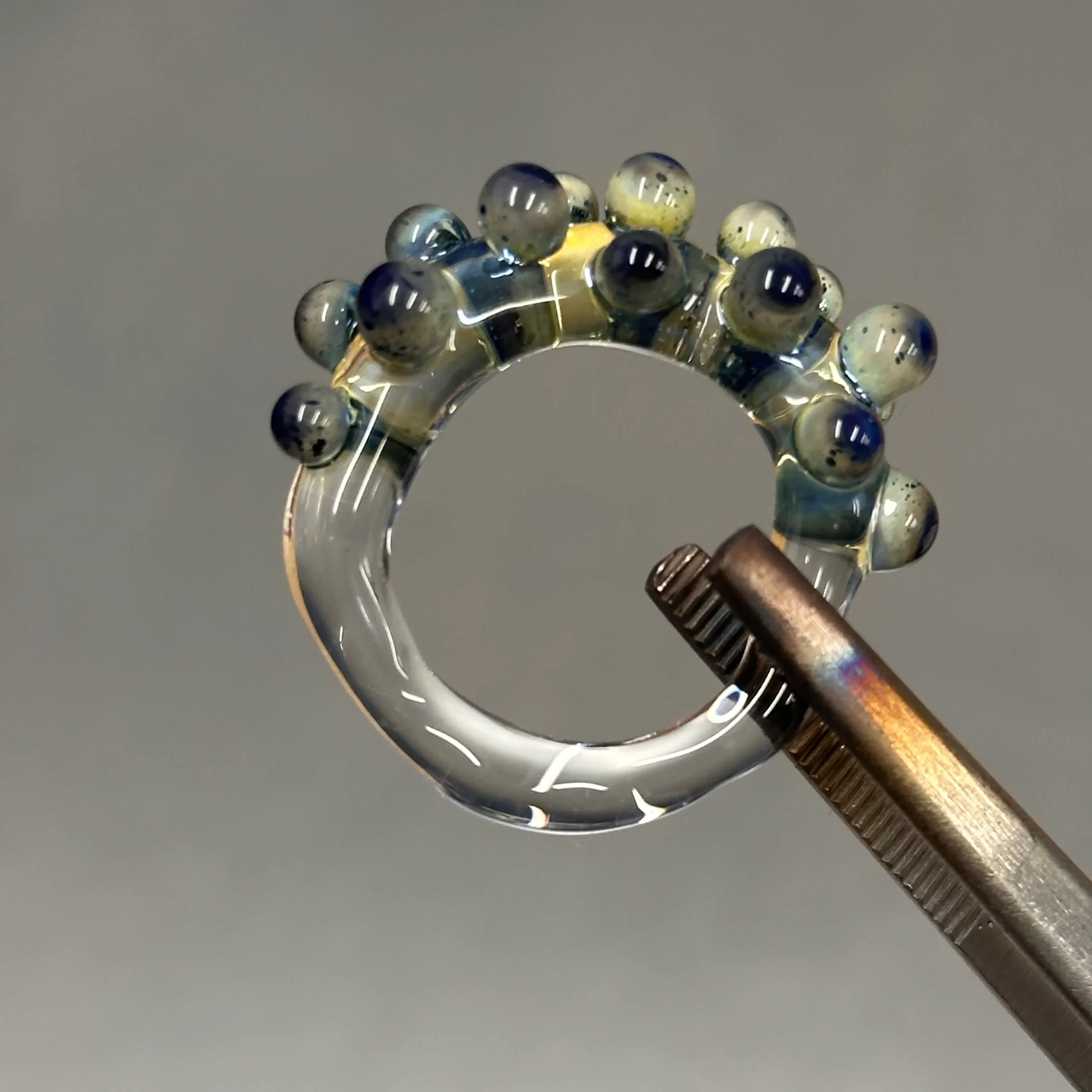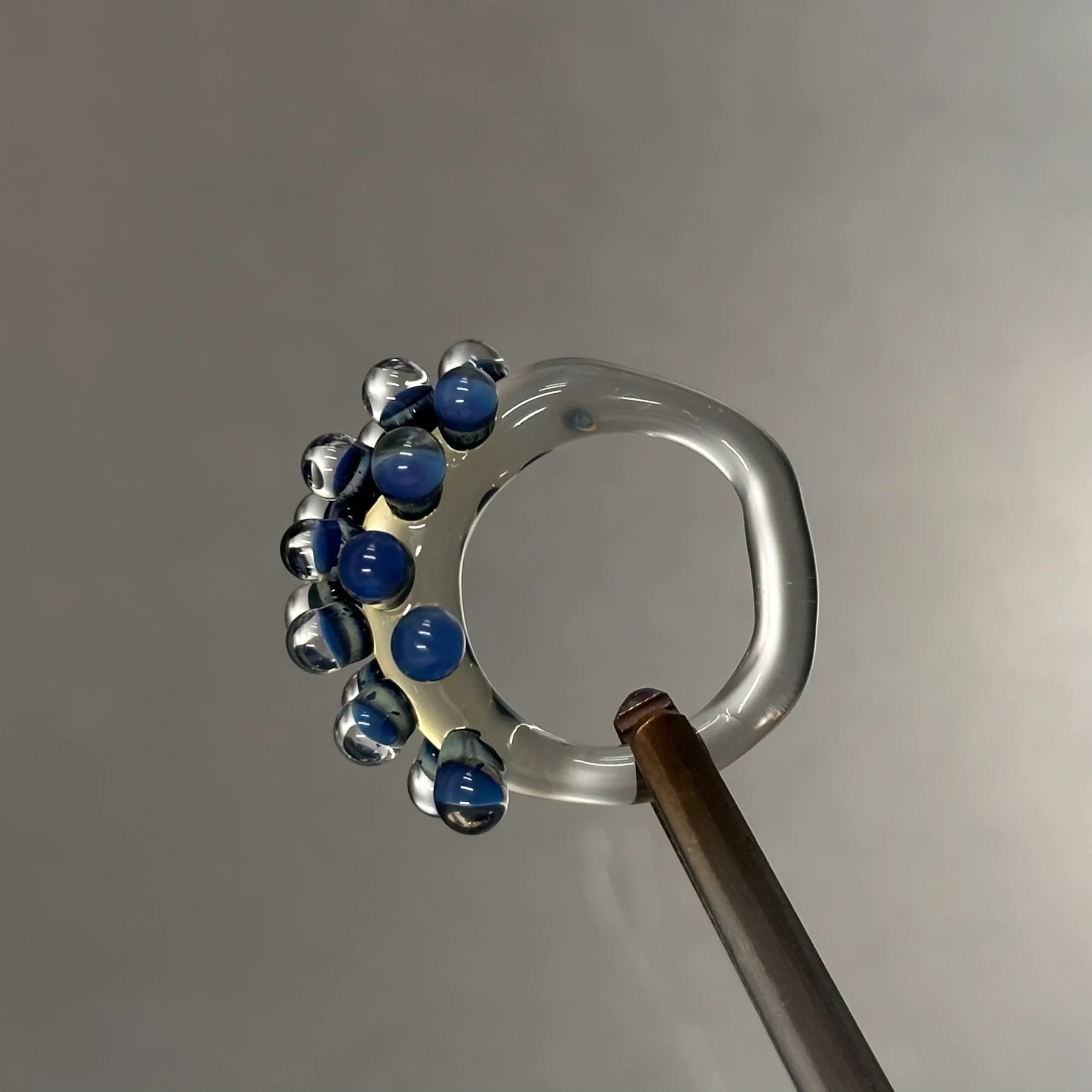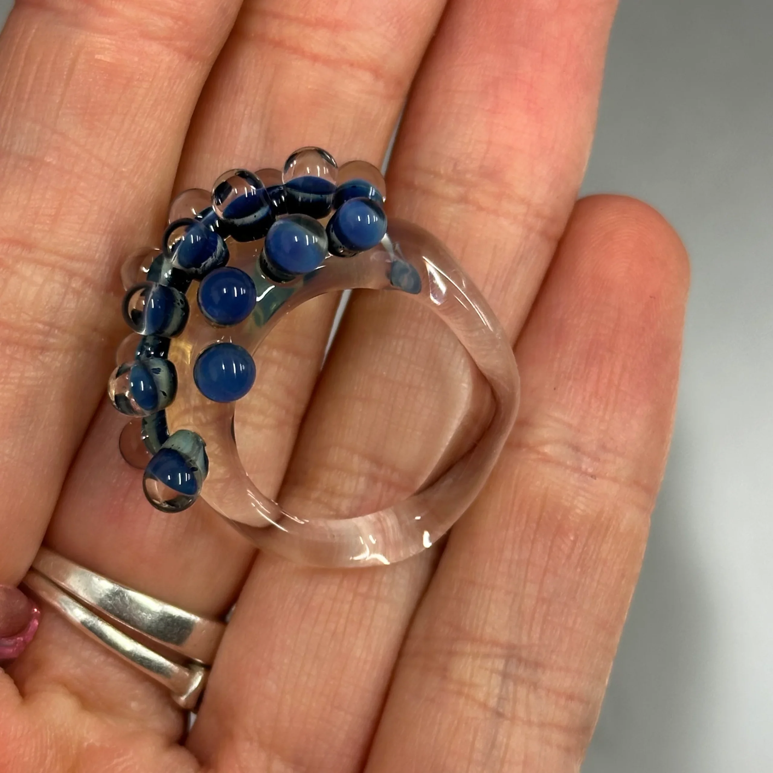 Anillo con base transparente o morada, con bolitas de vidrio que contienen fibra de plata. Cada bolita es única, creando efectos de color distintos, y algunas incluyen una capa de transparente que realza el brillo. Algunos modelos presentan la bolita en forma de flor.