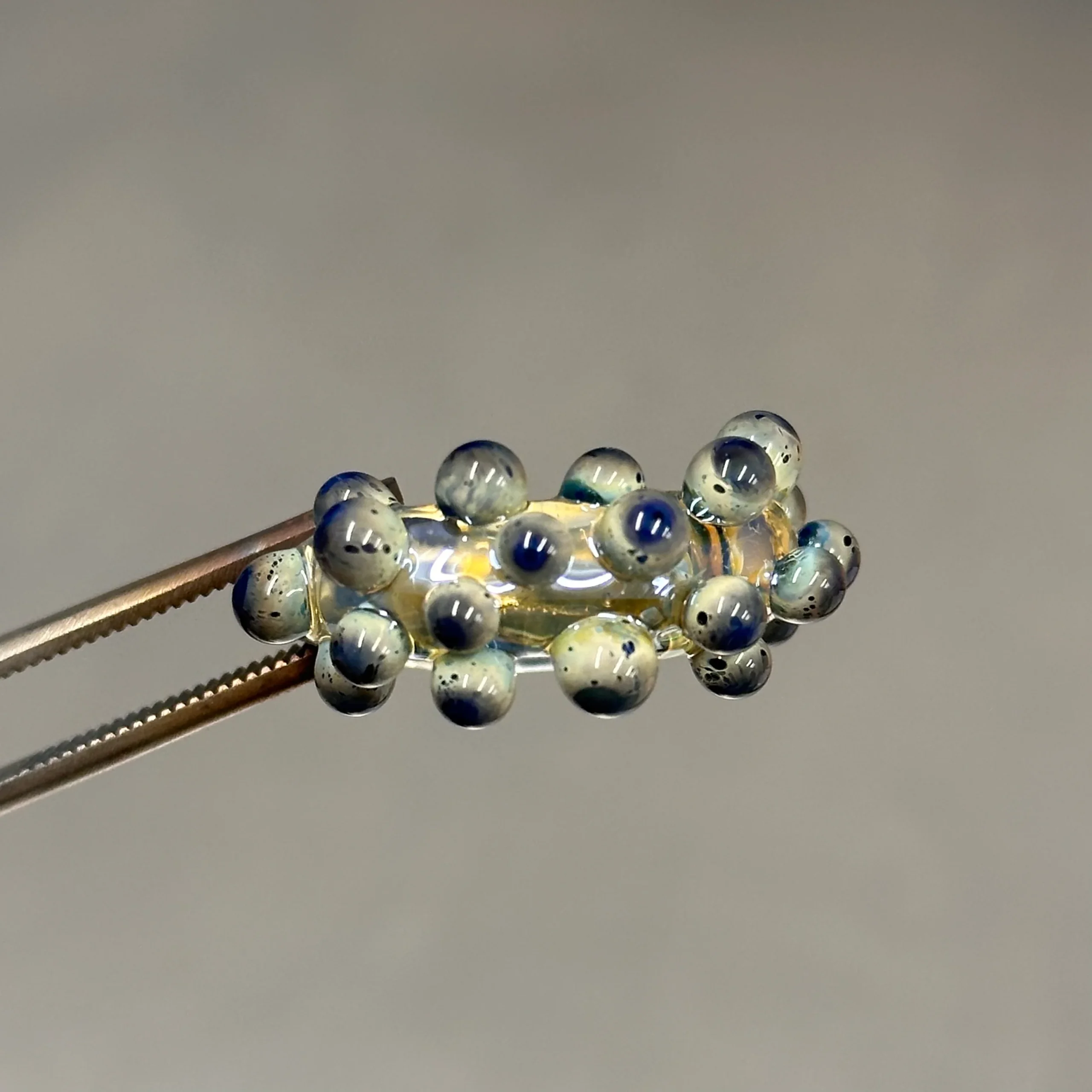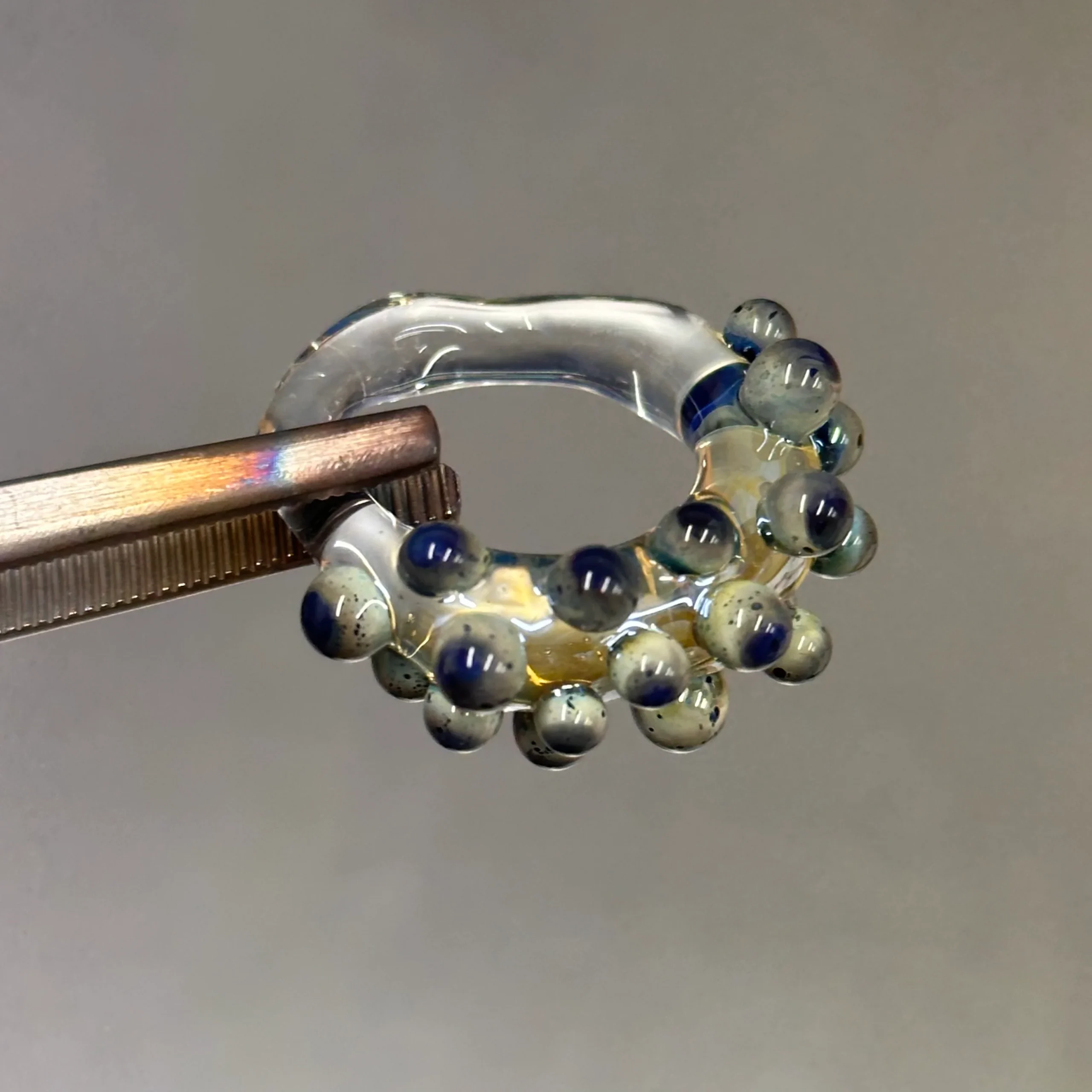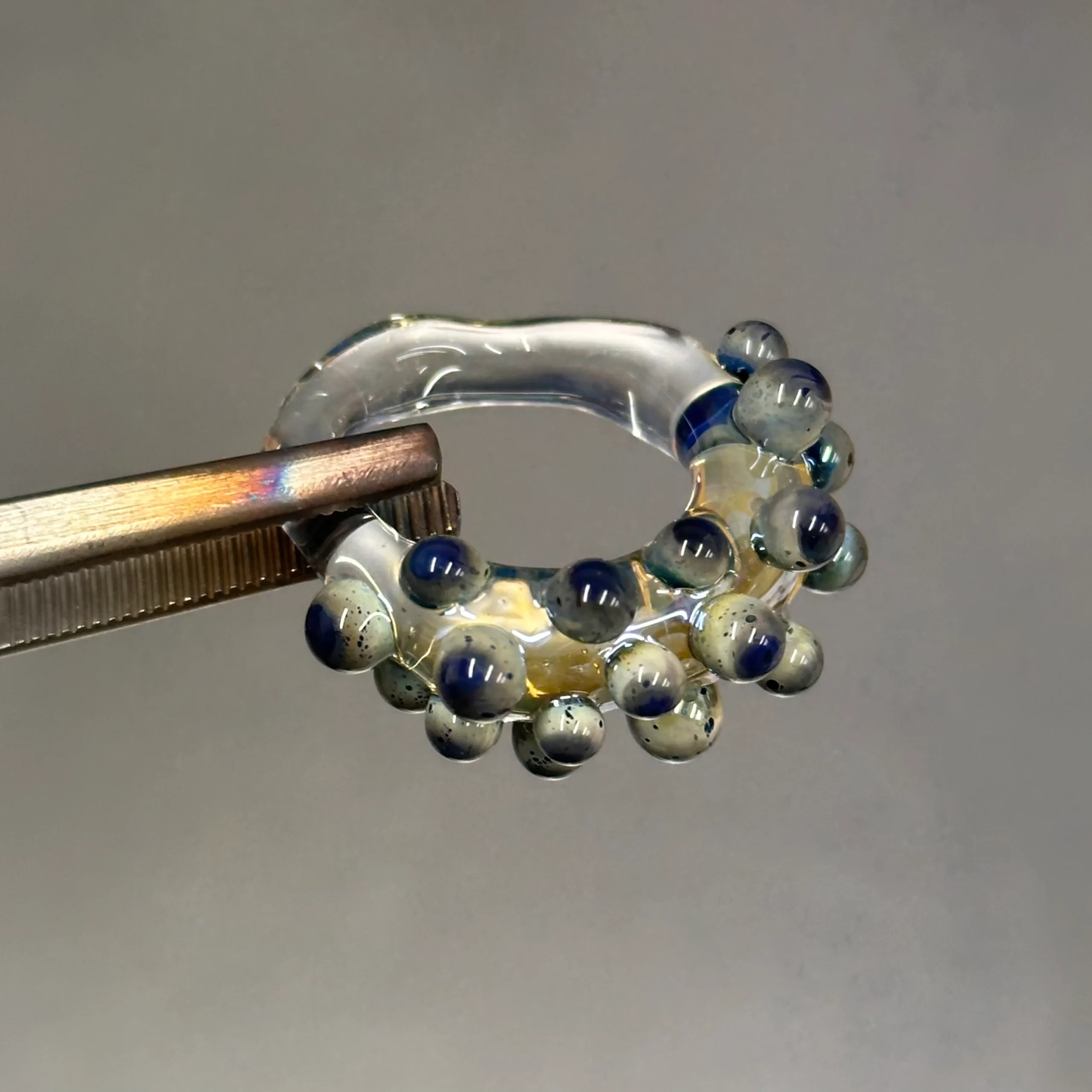 Anillo con base transparente o morada, con bolitas de vidrio que contienen fibra de plata. Cada bolita es única, creando efectos de color distintos, y algunas incluyen una capa de transparente que realza el brillo. Algunos modelos presentan la bolita en forma de flor.
