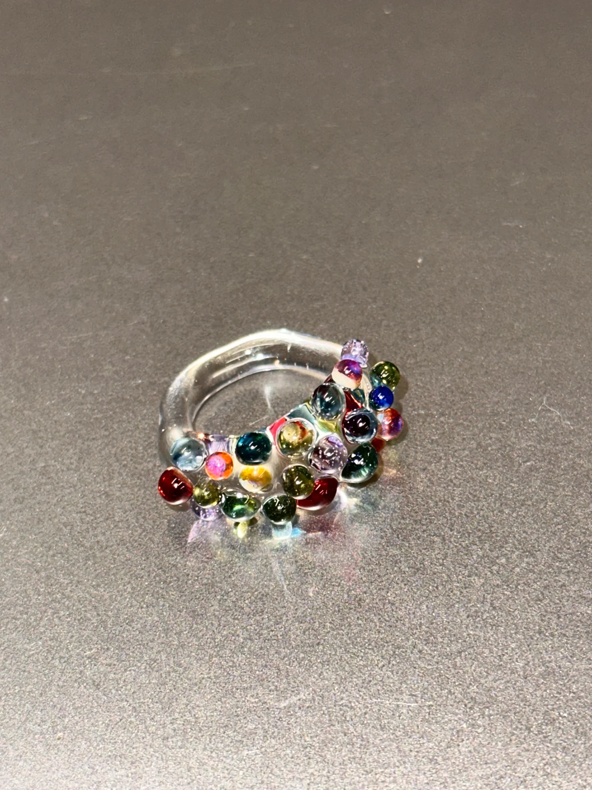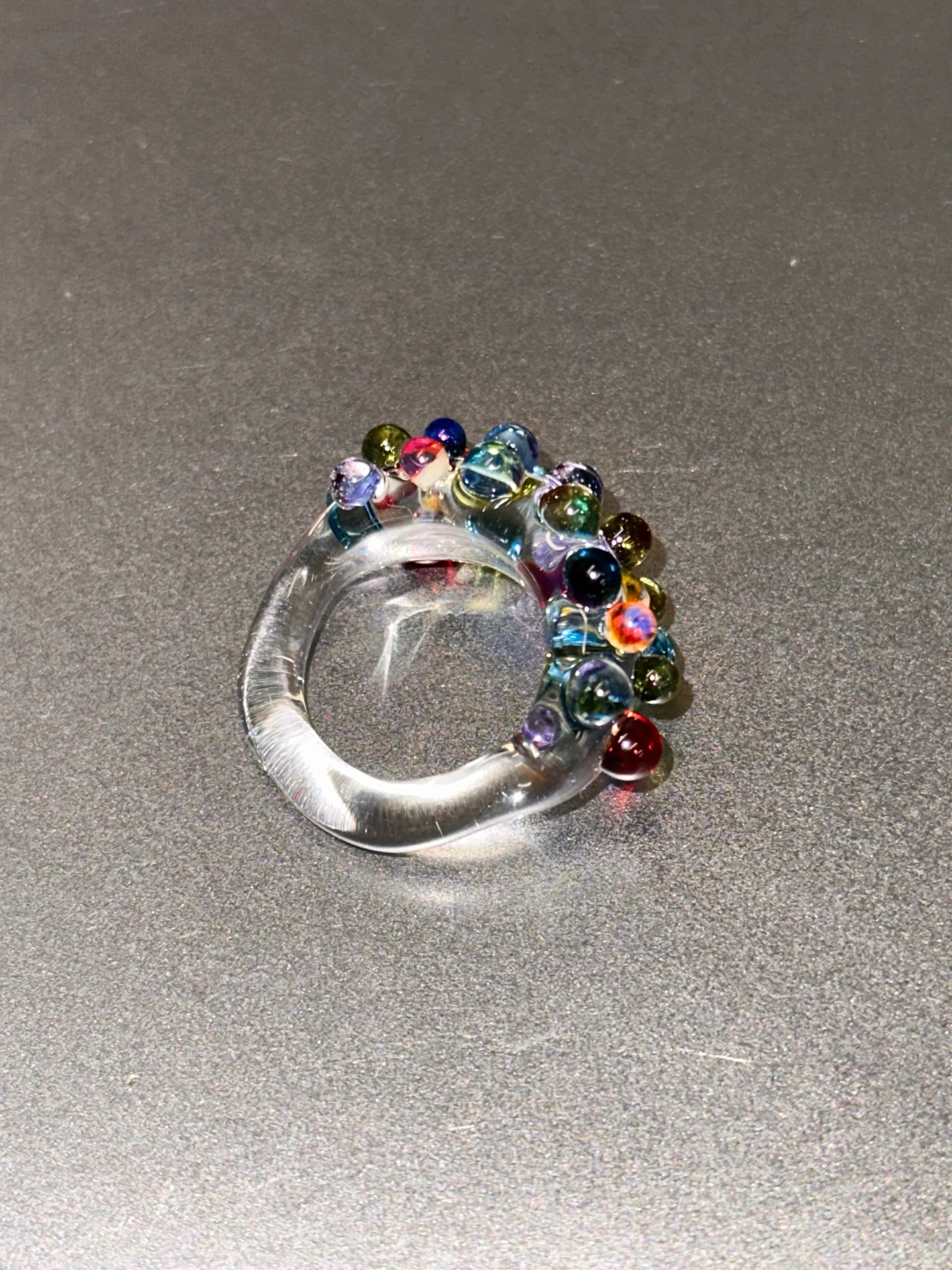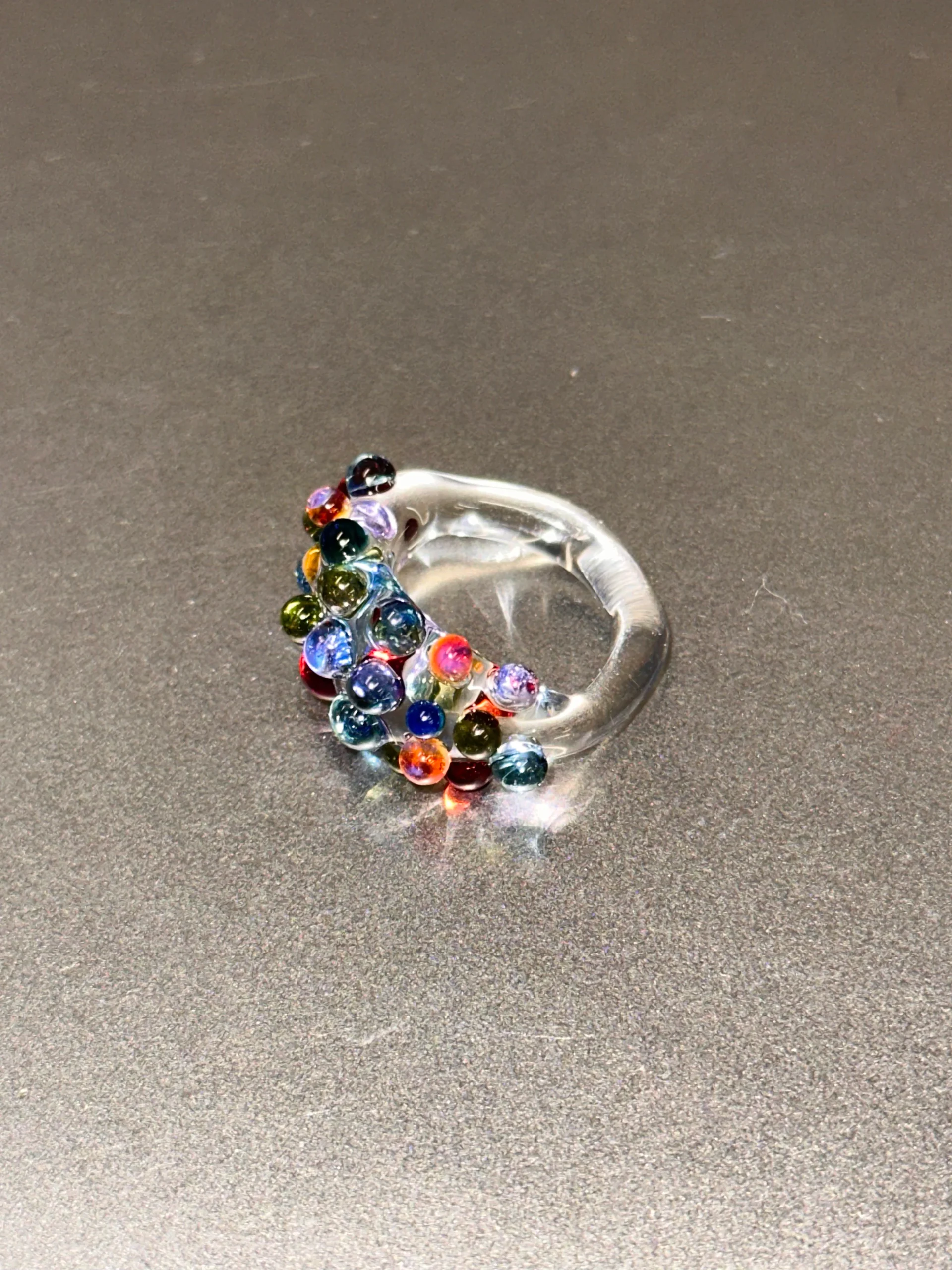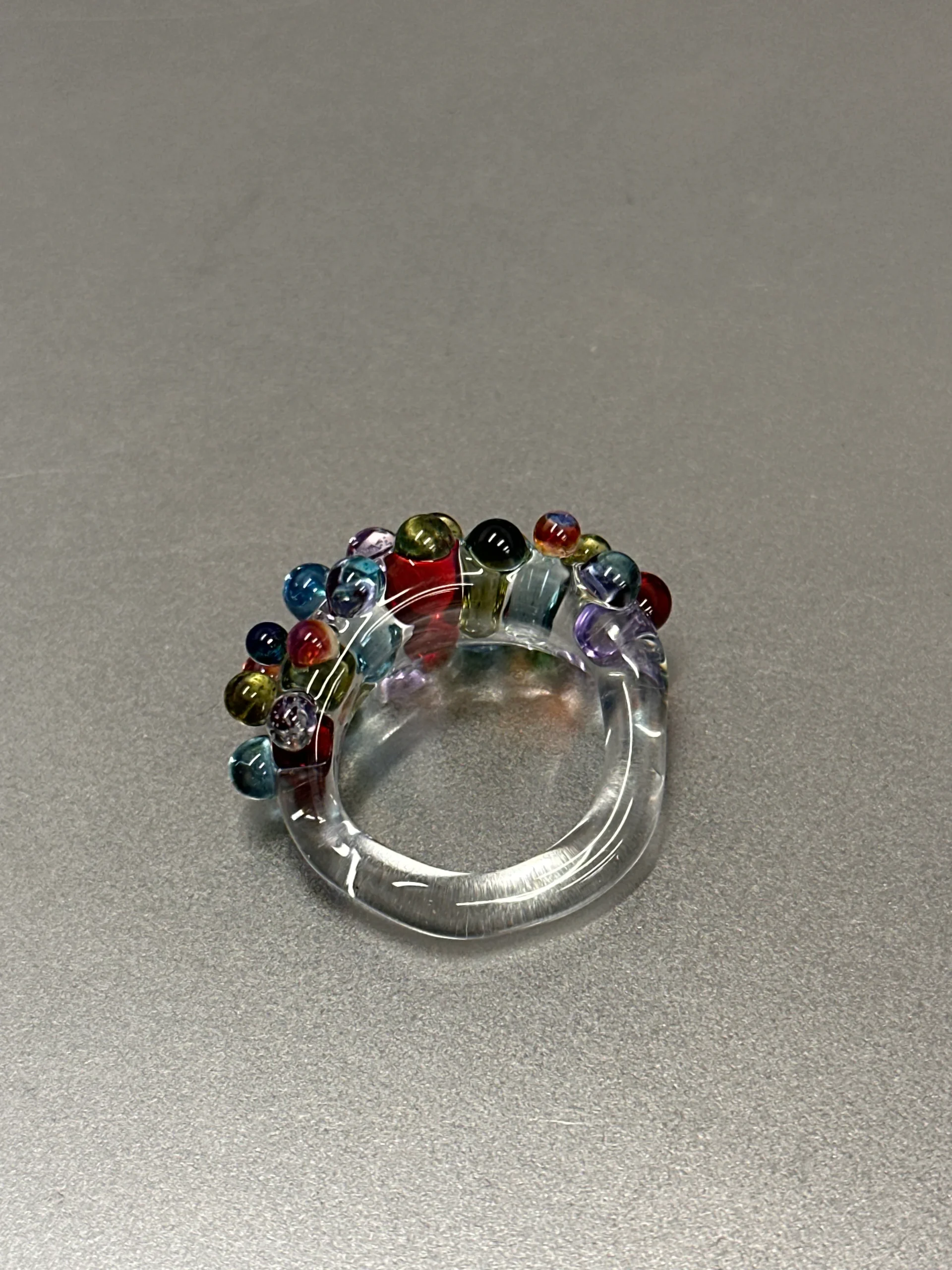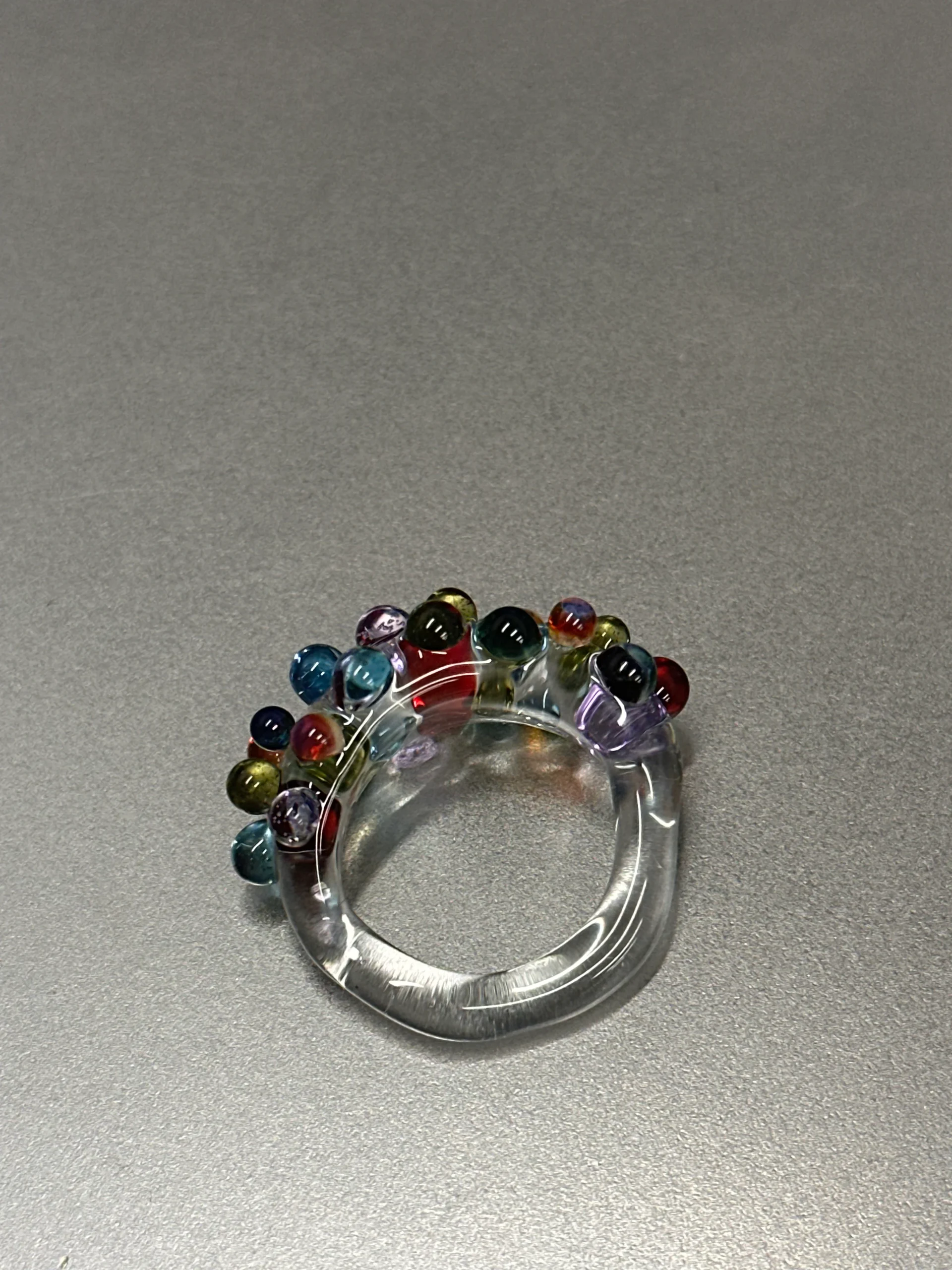 Anillo amarillo con bolitas de efectos encapsuladas, Anillo bolitas multicolor, Anillo centro plateado, Anillo flor granate, Anillo mariposa efectos, Anillo mariposa verde, Anillo rosa con flor amarilla