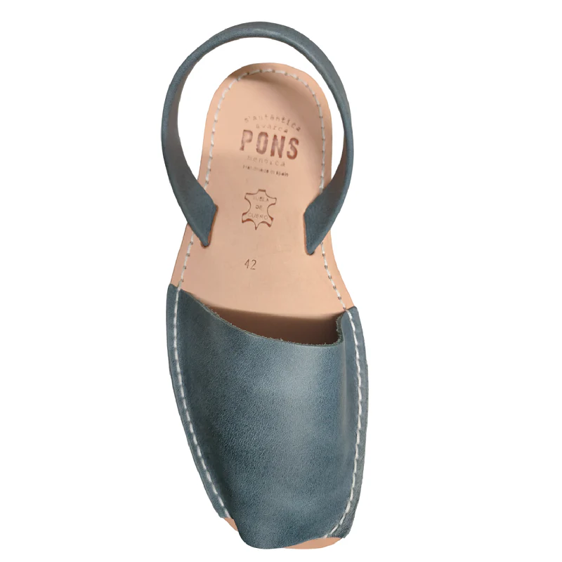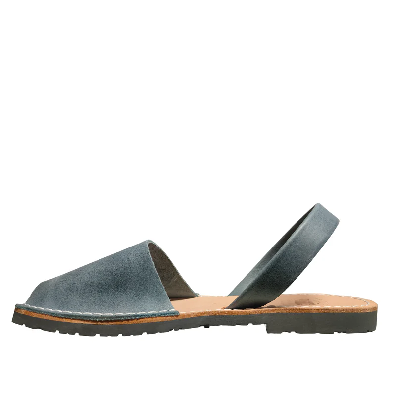 Avarca menorquina plana de piel en color azul. Plantilla anatómica con la forma hecha del pie y suela ligera para una huella cómoda. el calzado de moda para el verano estilo chic, comodidad y versatilidad en una amplia variedad de modelos no te quedes sin ella!