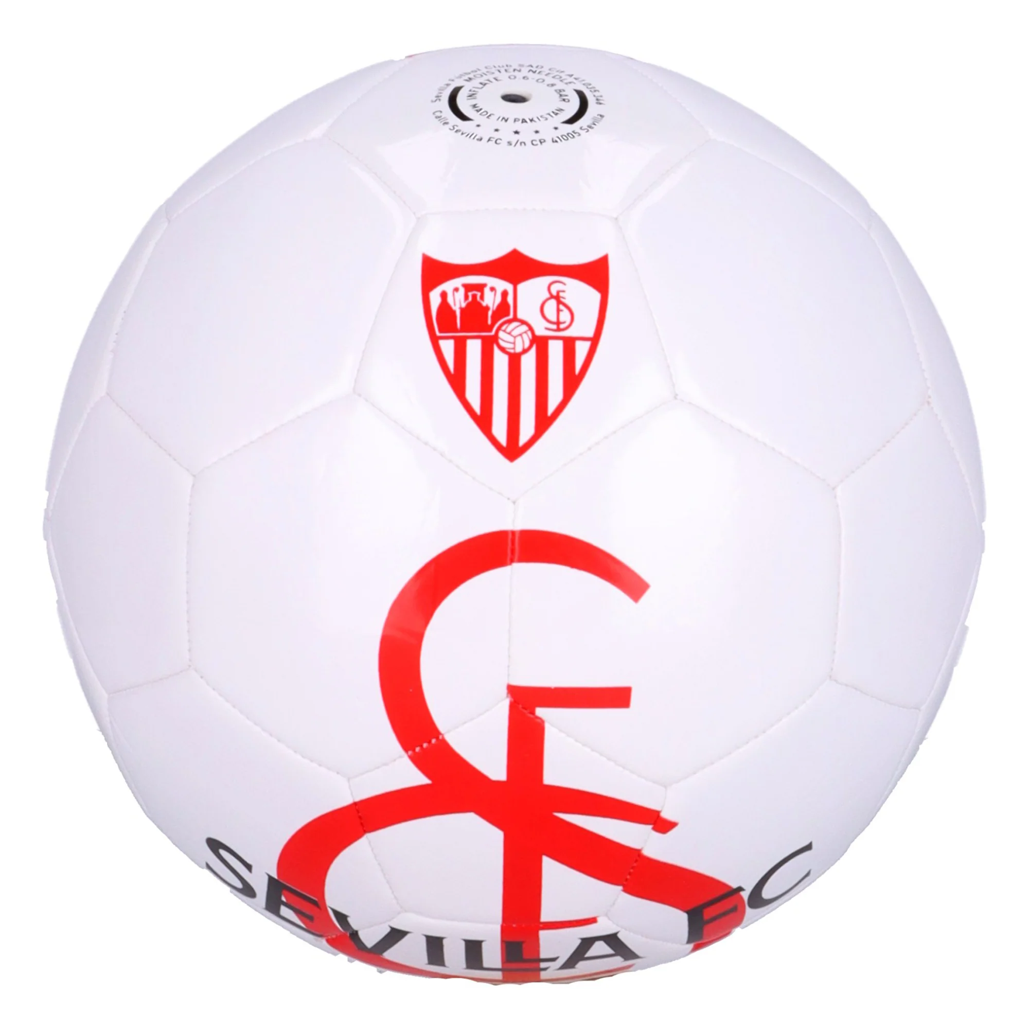 Balón blanco con escudo y eslogan del Sevilla FC. Balón de fútbol de tamaño estándar.