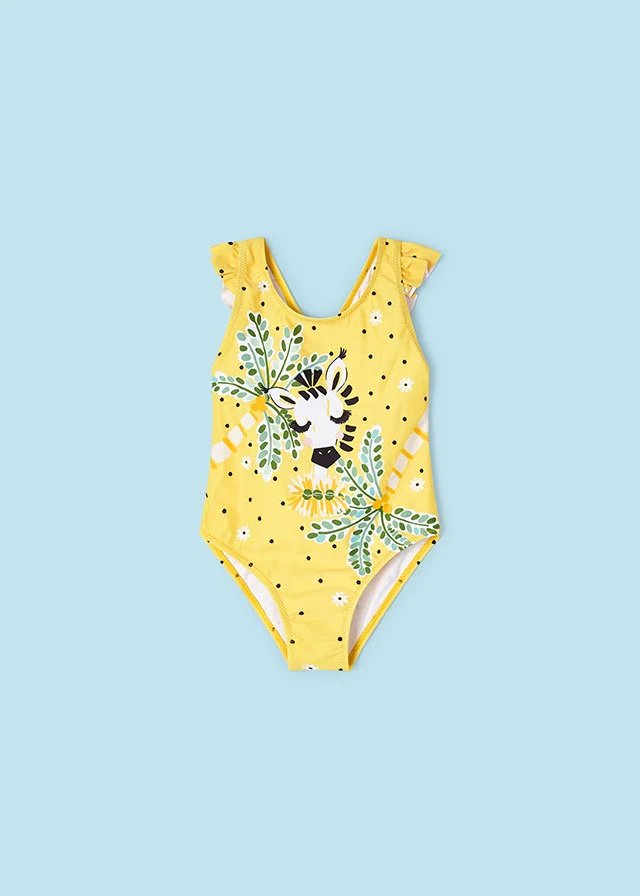 ¡Hermoso traje de baño completo de dibujo estampado! ¡Divino y divertido para este verano! Perfecto para disfrutar con estilo de los días de playa en verano. Traje de baño completo, dibujo frontal estampado, tirantes cruzados por la espalda en v con olanes decorativos, de cuello redondo.