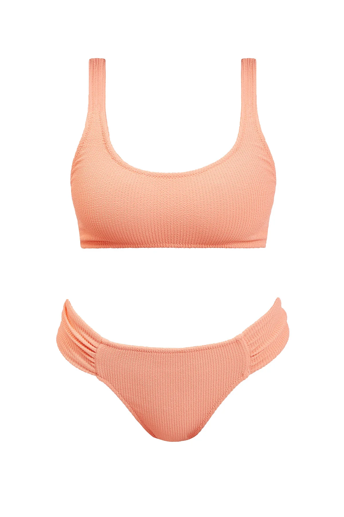 Bikini con top tipo camiseta. Escote redondo. Podes combinarlo con la bombacha Drapeada que hace juego o con cualquiera de nuestras bombachas del mix&match. Tiene bolsillos para agregarle tazas de relleno. Lycra con protección UV+50. El precio es por el conjunto.