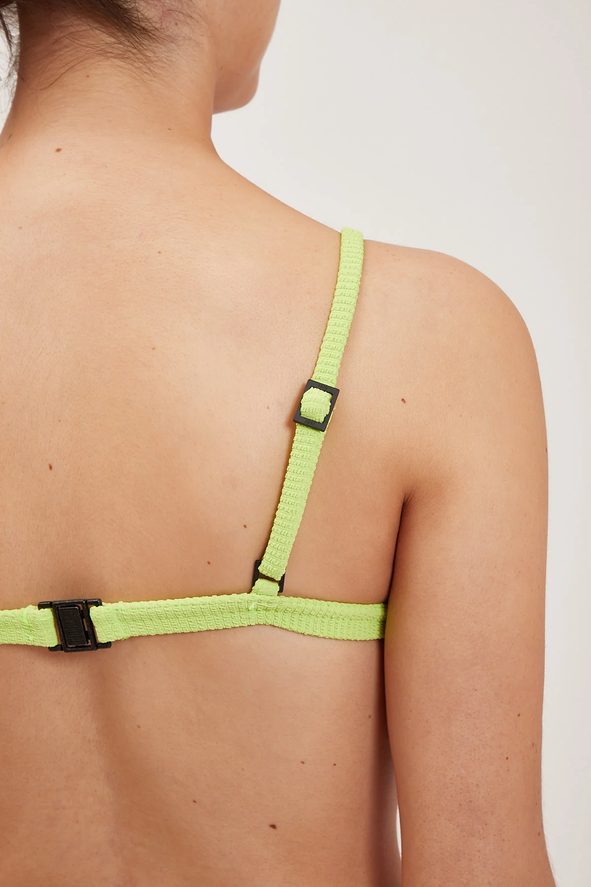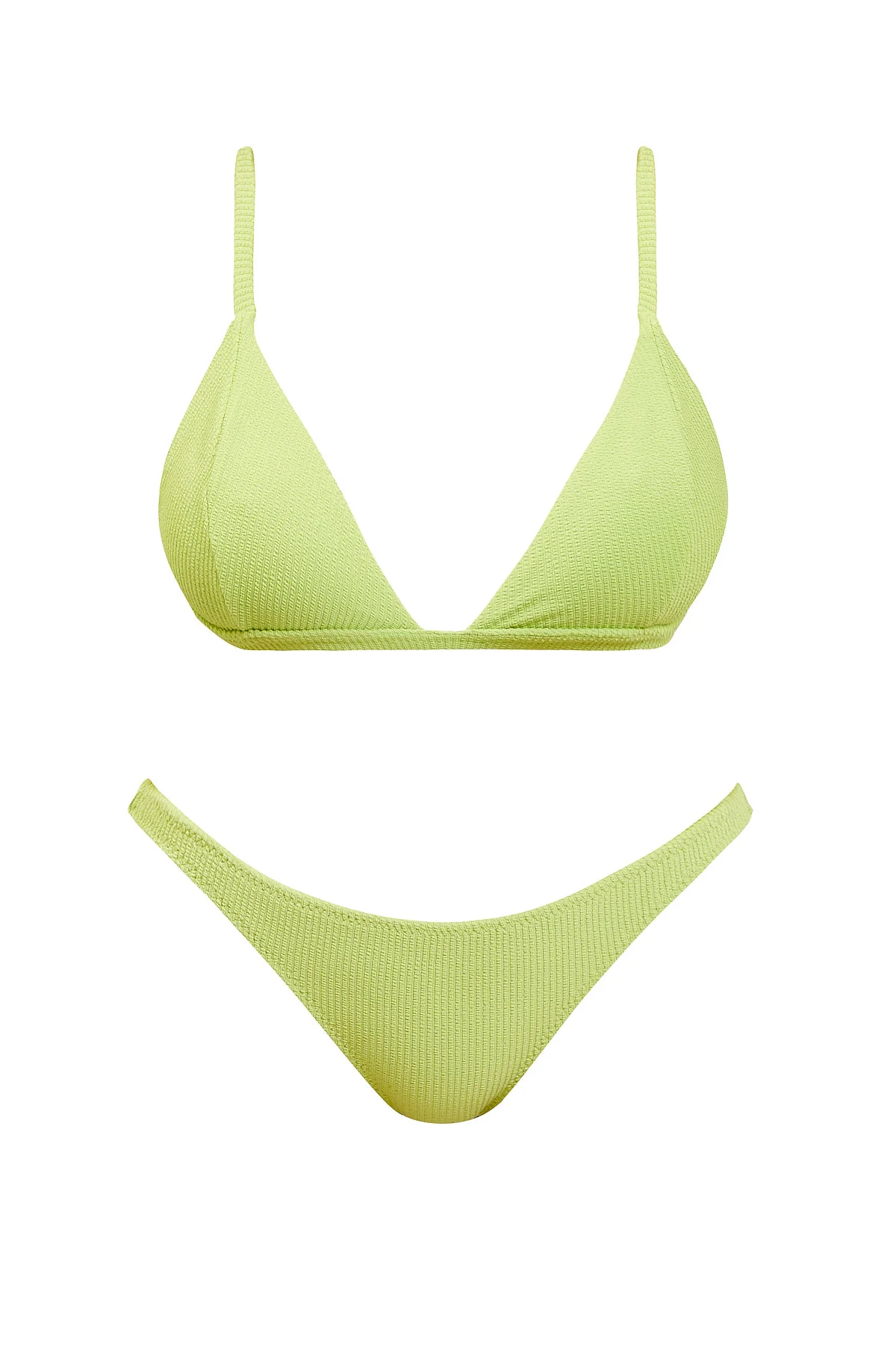 Bikini con top triangulito fijo. Breteles con reguladores y gancho en espalda. Podes combinarlo con la braga Tanga que hace juego o con cualquiera de nuestras bombachas del mix&match. Lycra con protección UV+50. El precio es por el conjunto.