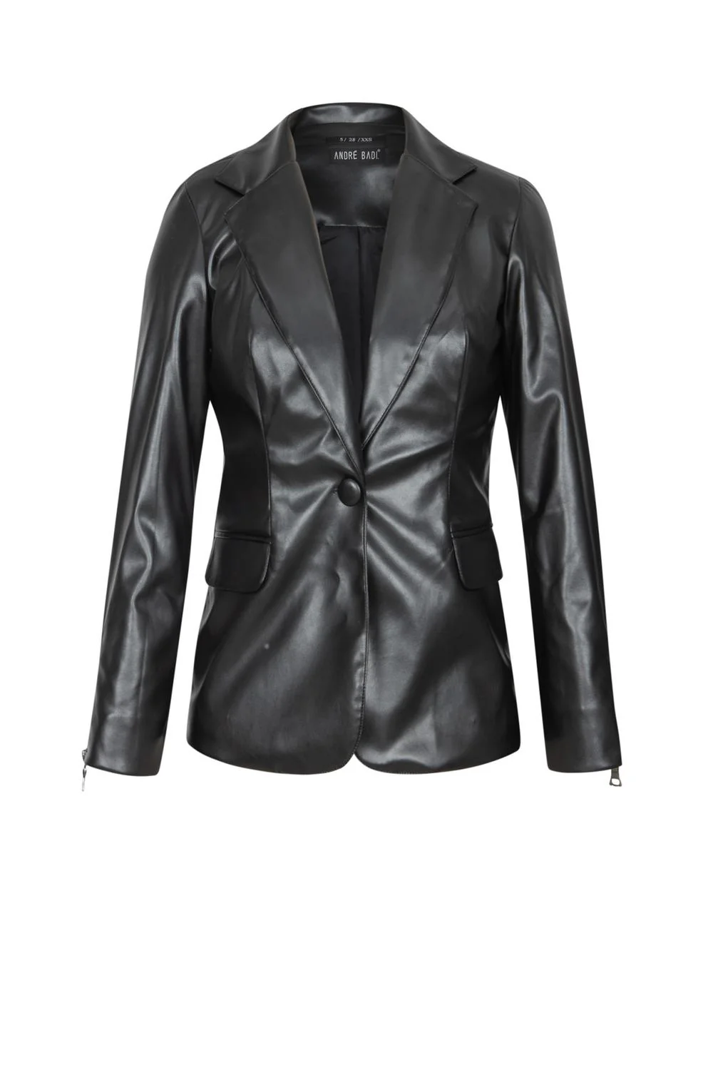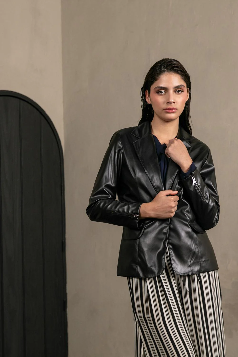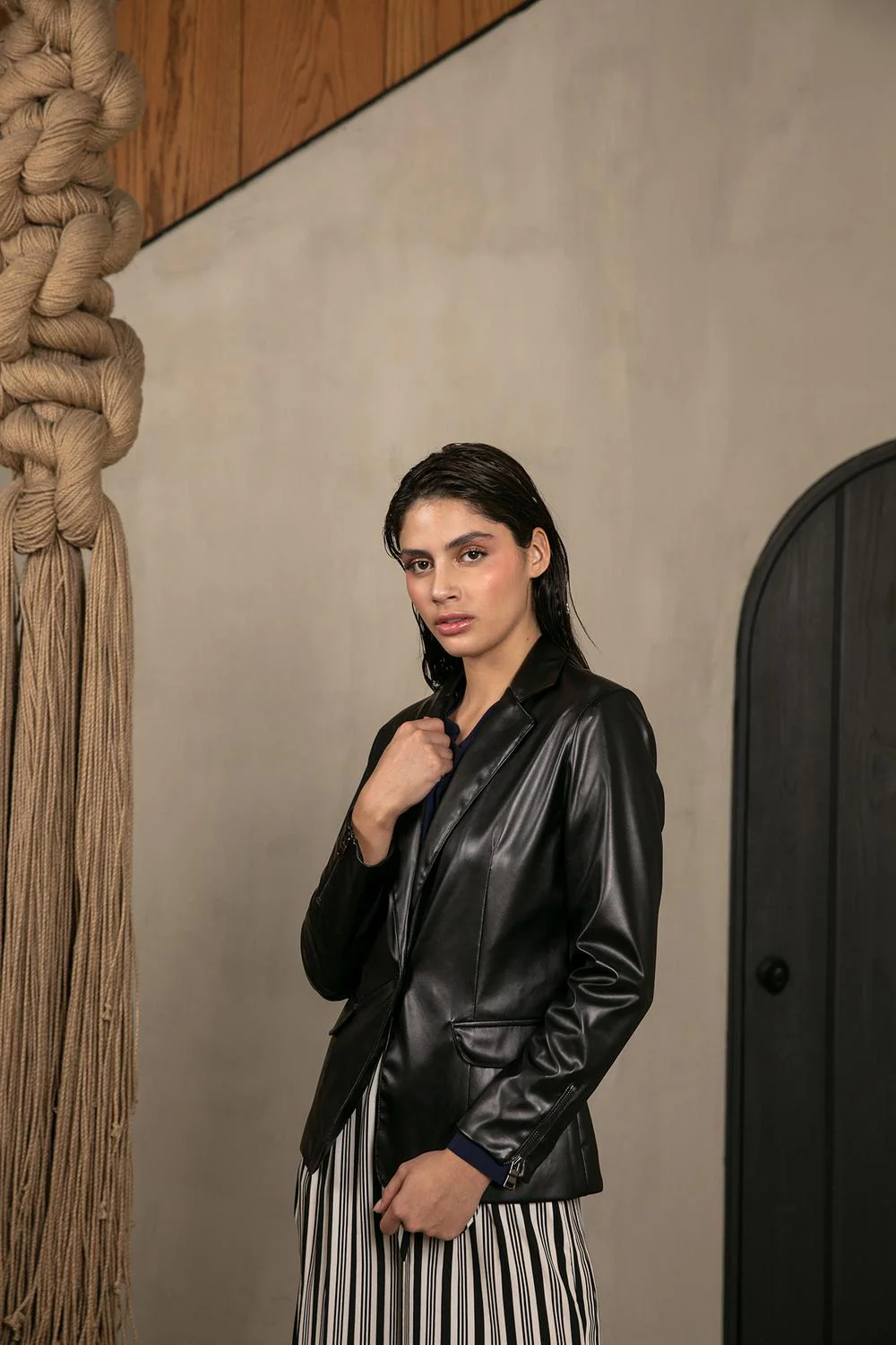 Blazer de efecto piel con solapa, hombreras, mangas largas, cierre en puños, carteras decorativas y botonadura frontal. 42-0502