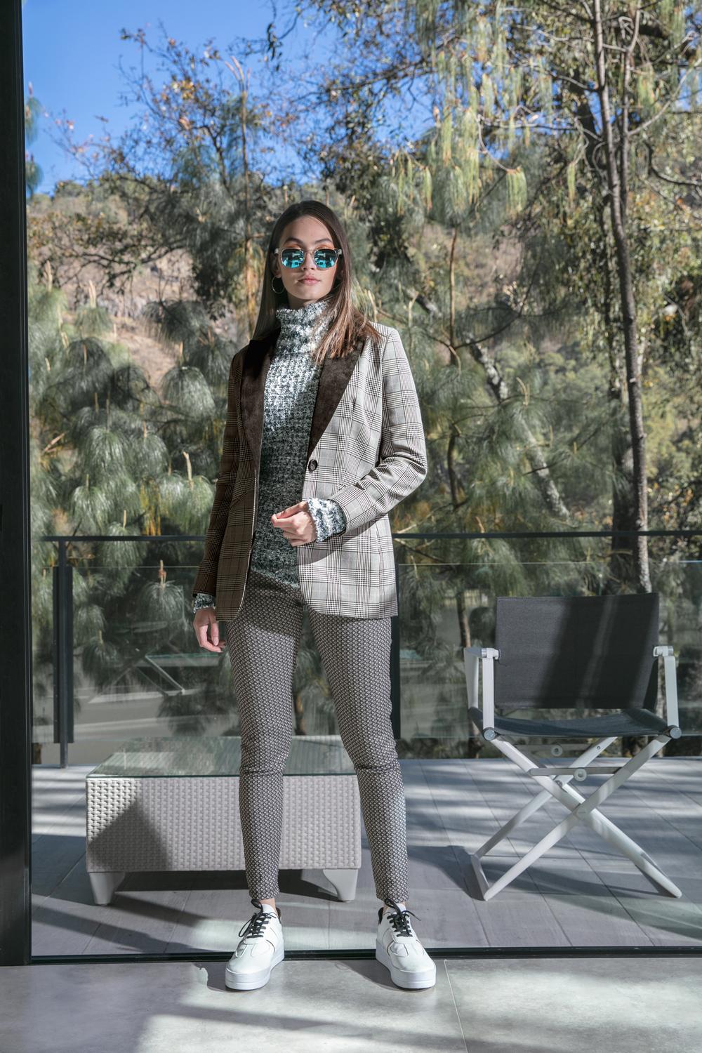 - Blazer a cuadros con solapa a contraste de color, botonadura frontal, bolsillos de vivo en los laterales y mangas largas.
