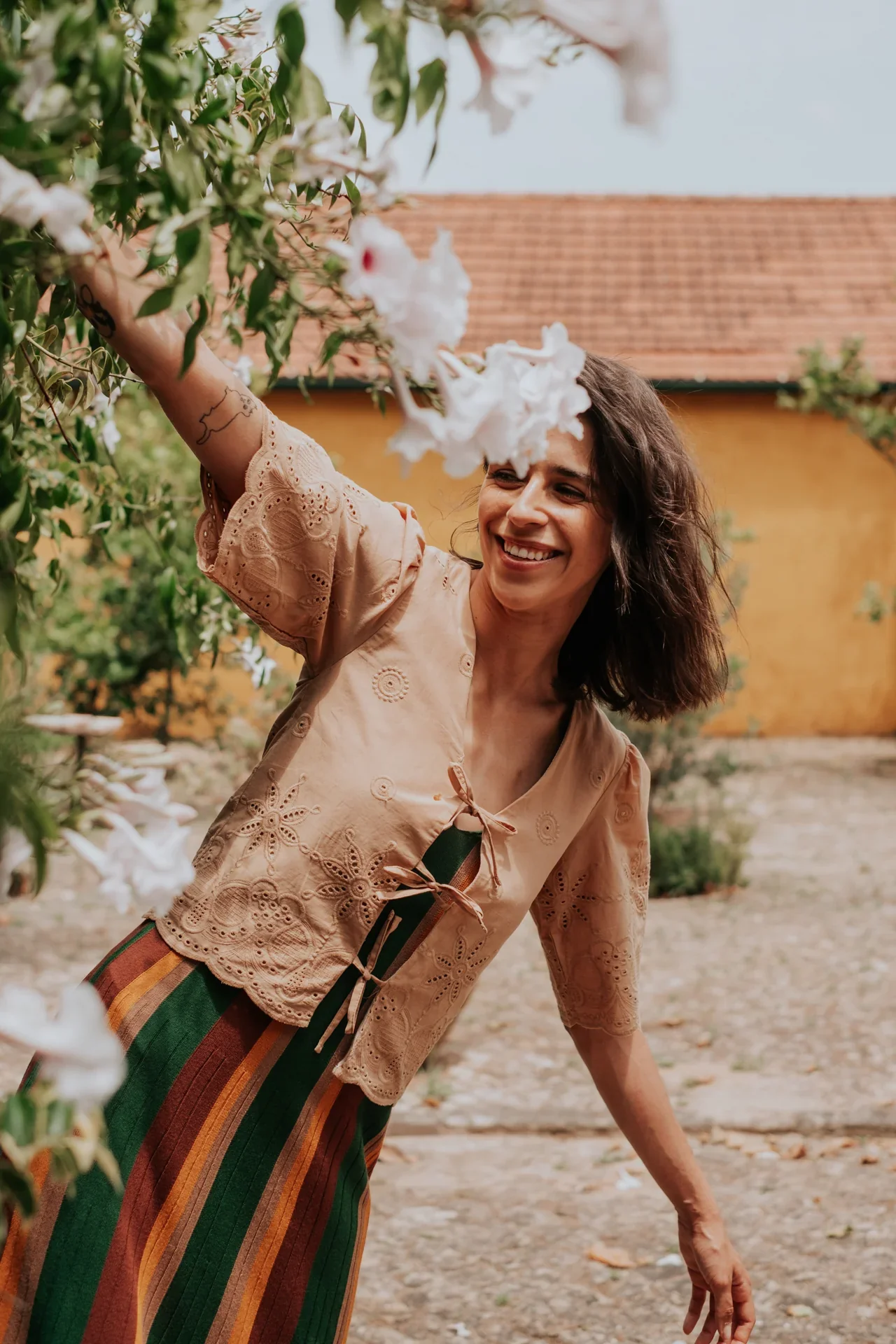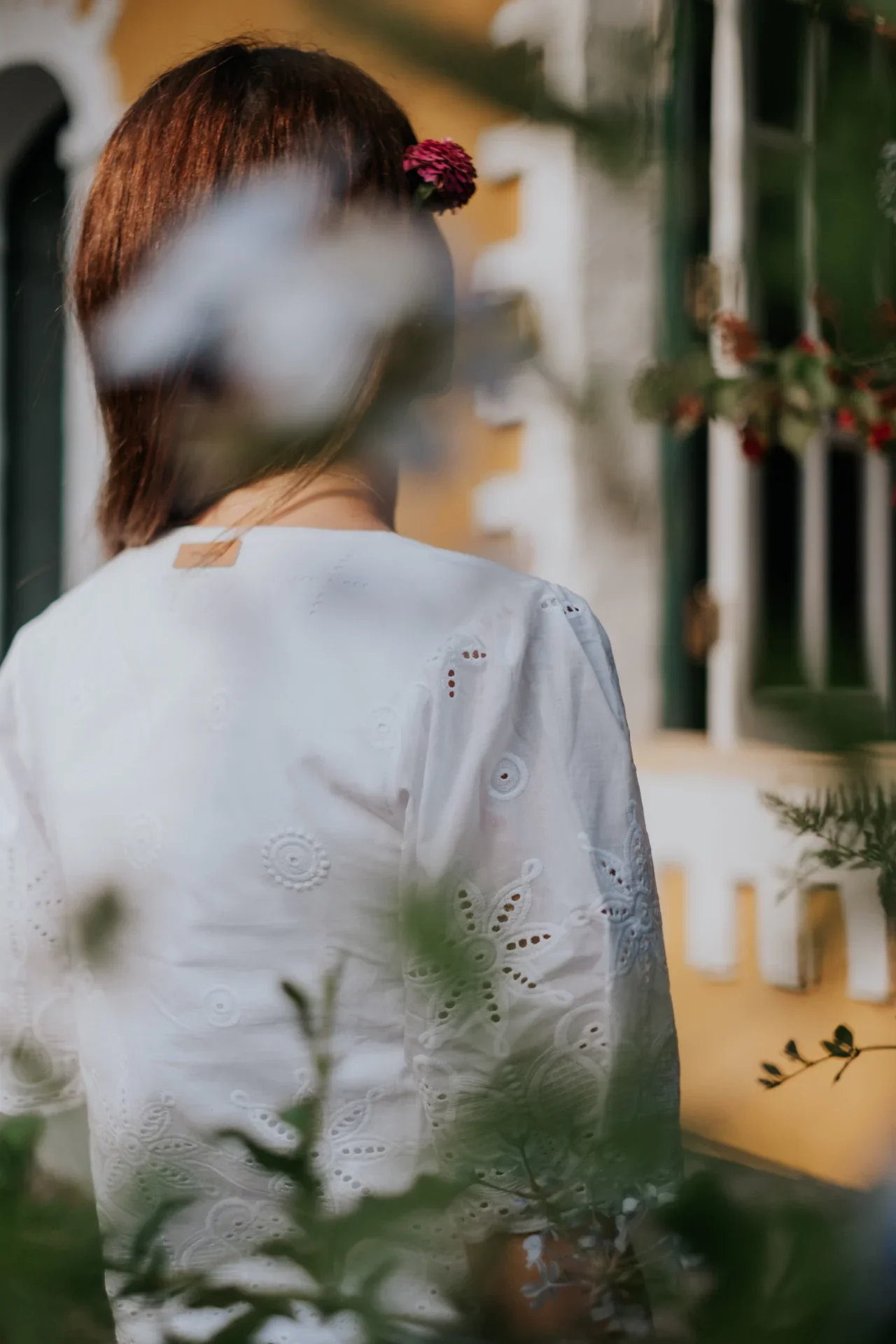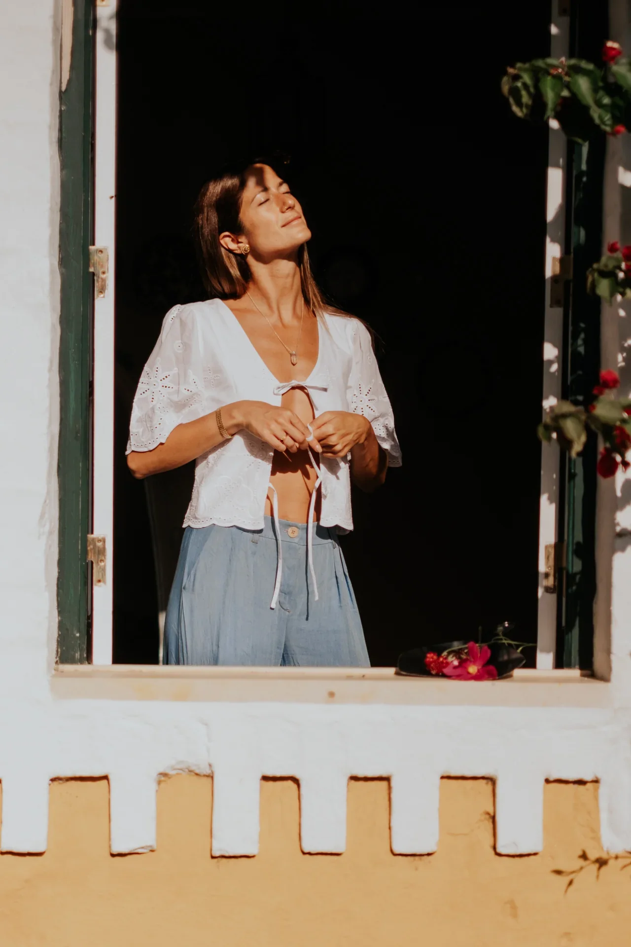 Está confeccionada con algodón 100% orgánico y por su bordado inglés; destaca por las siluetas florales y está unida por lazos que cierran la blusa.
