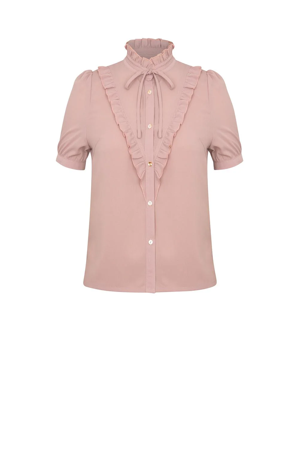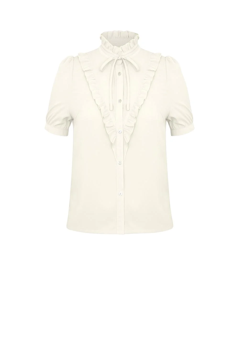 Blusa con cuello mao, olanes decorativos, botonadura frontal, lazo decorativo y mangas cortas plisadas. 27-2542