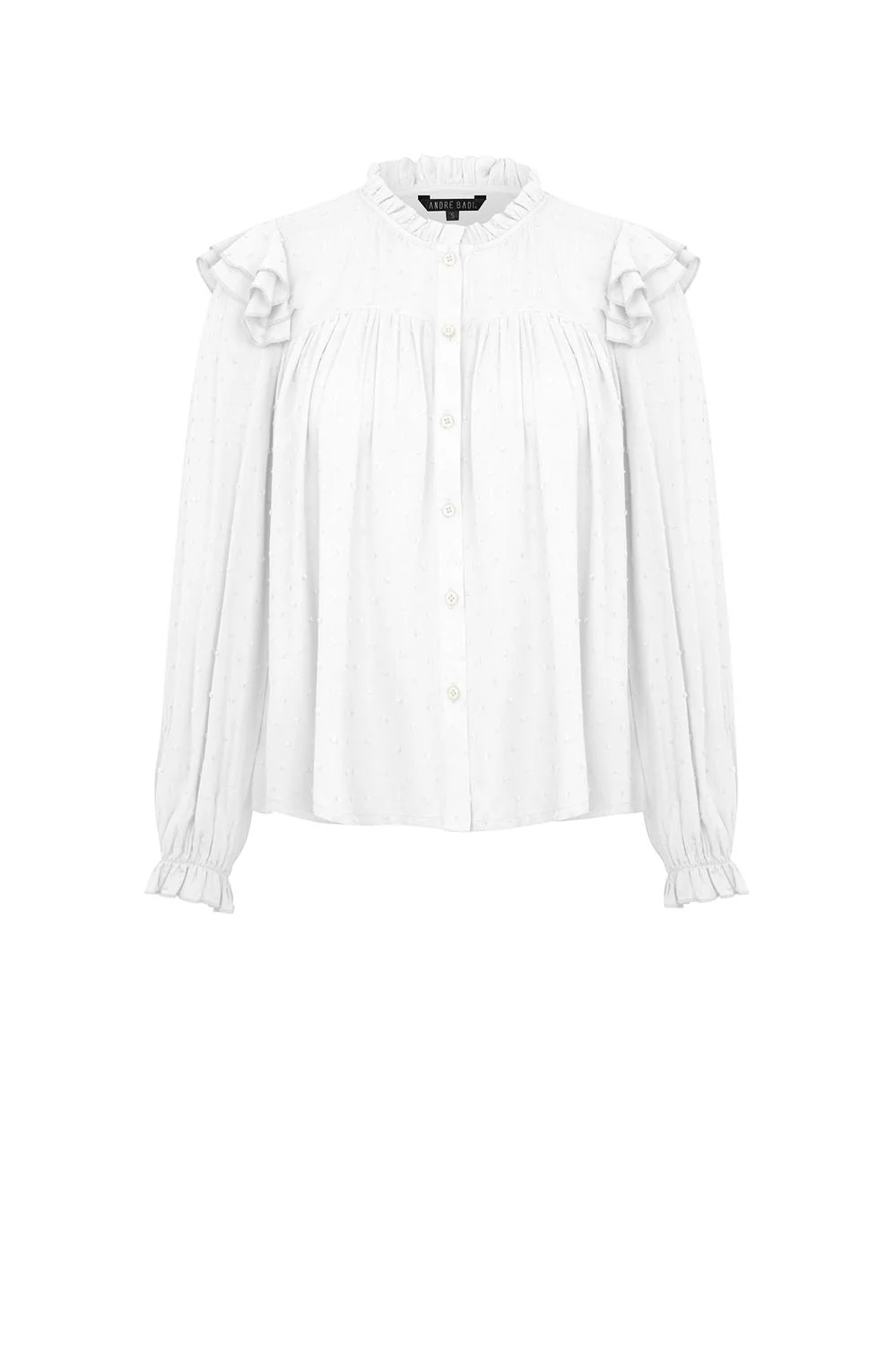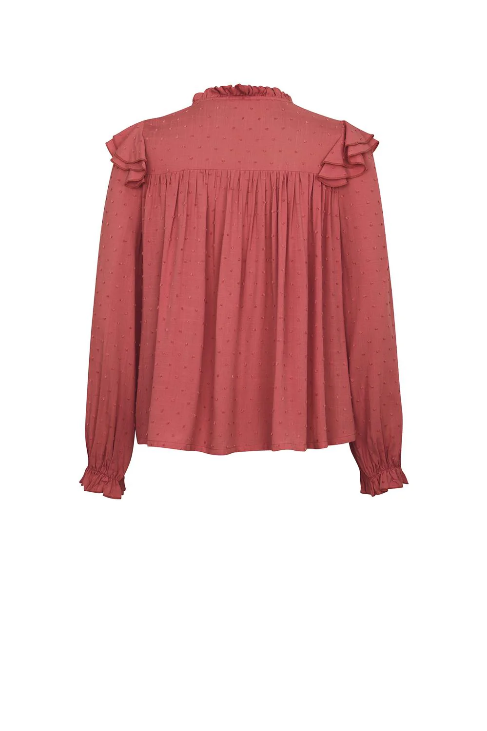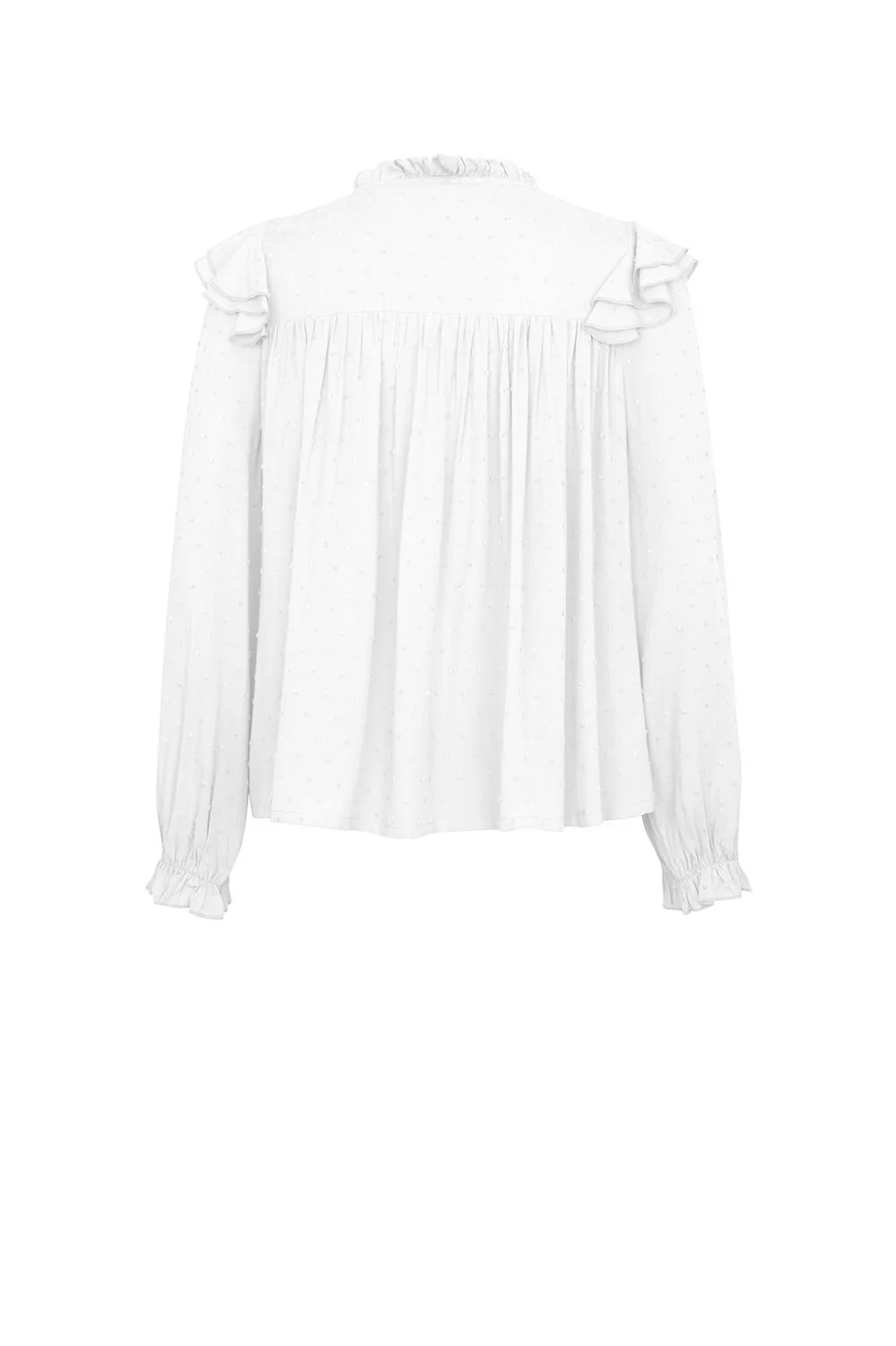Blusa con tela texturizada, escote redondo, botonadura frontal, corte decorativo en parte superior, plisado en talle, múltiples olanes decorativos, mangas largas y elástico en puños.