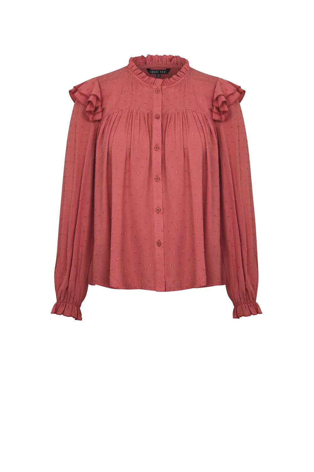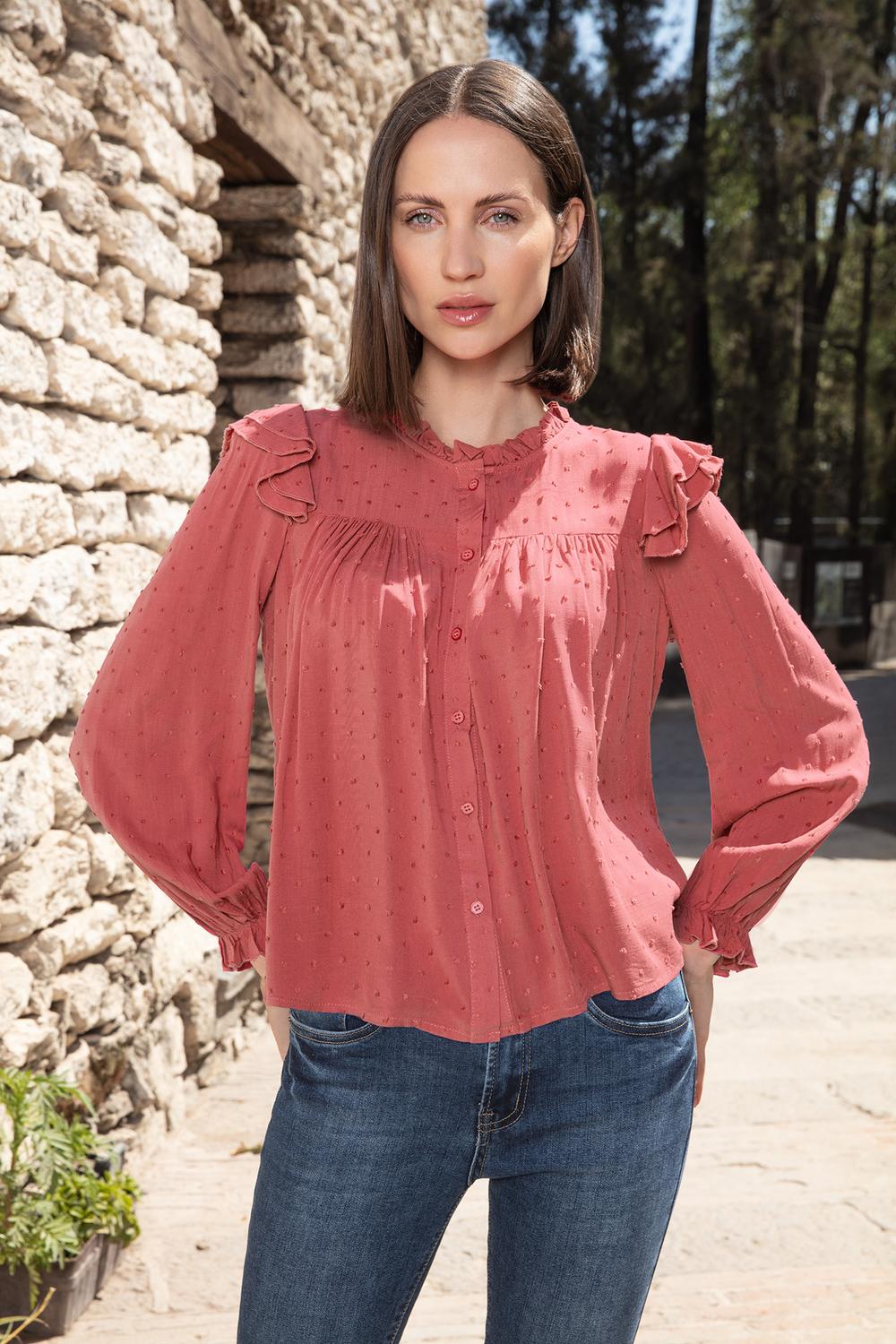- Blusa con tela texturizada, escote redondo, botonadura frontal, corte decorativo en parte superior, plisado en talle, múltiples olanes decorativos, mangas largas y elástico en puños.