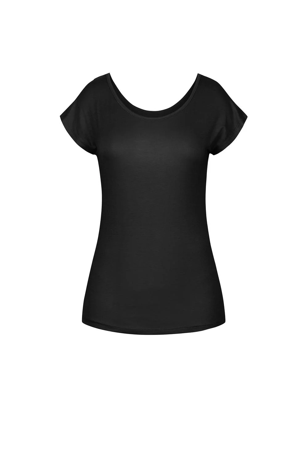 - Blusa básica de cuello redondo amplio y mangas continuas.