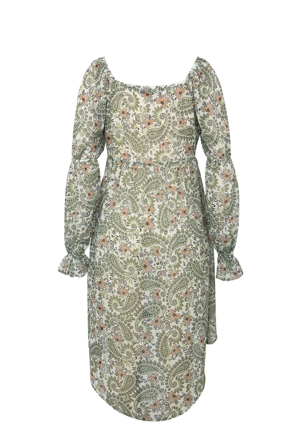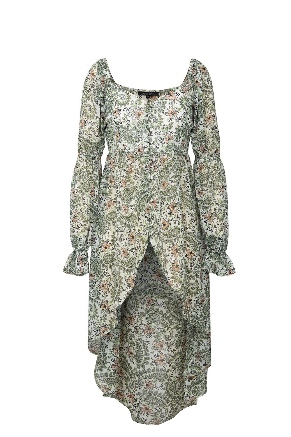 - Blusa estampada larga con transparencia, escote en ”V”, ruedo asimétrico y botonadura frontal.