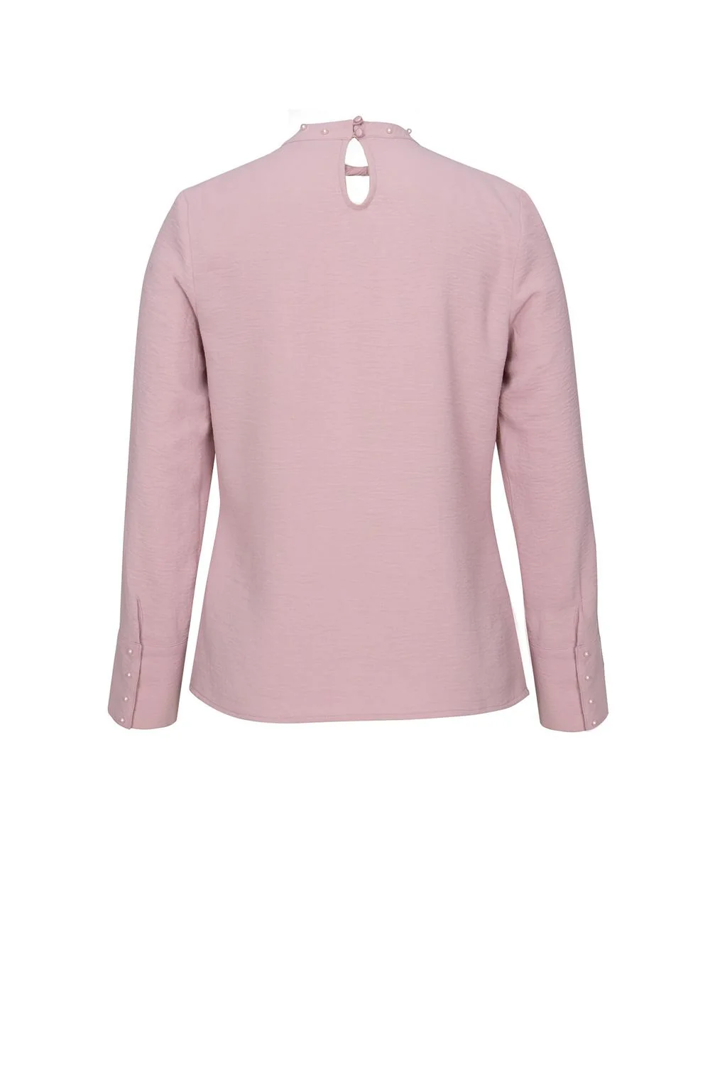 Blusa, cuello con torsión central, abertura en escote, mangas largas, puños anchos, plisados decorativos y aplicaciones de perlas. 27-2735