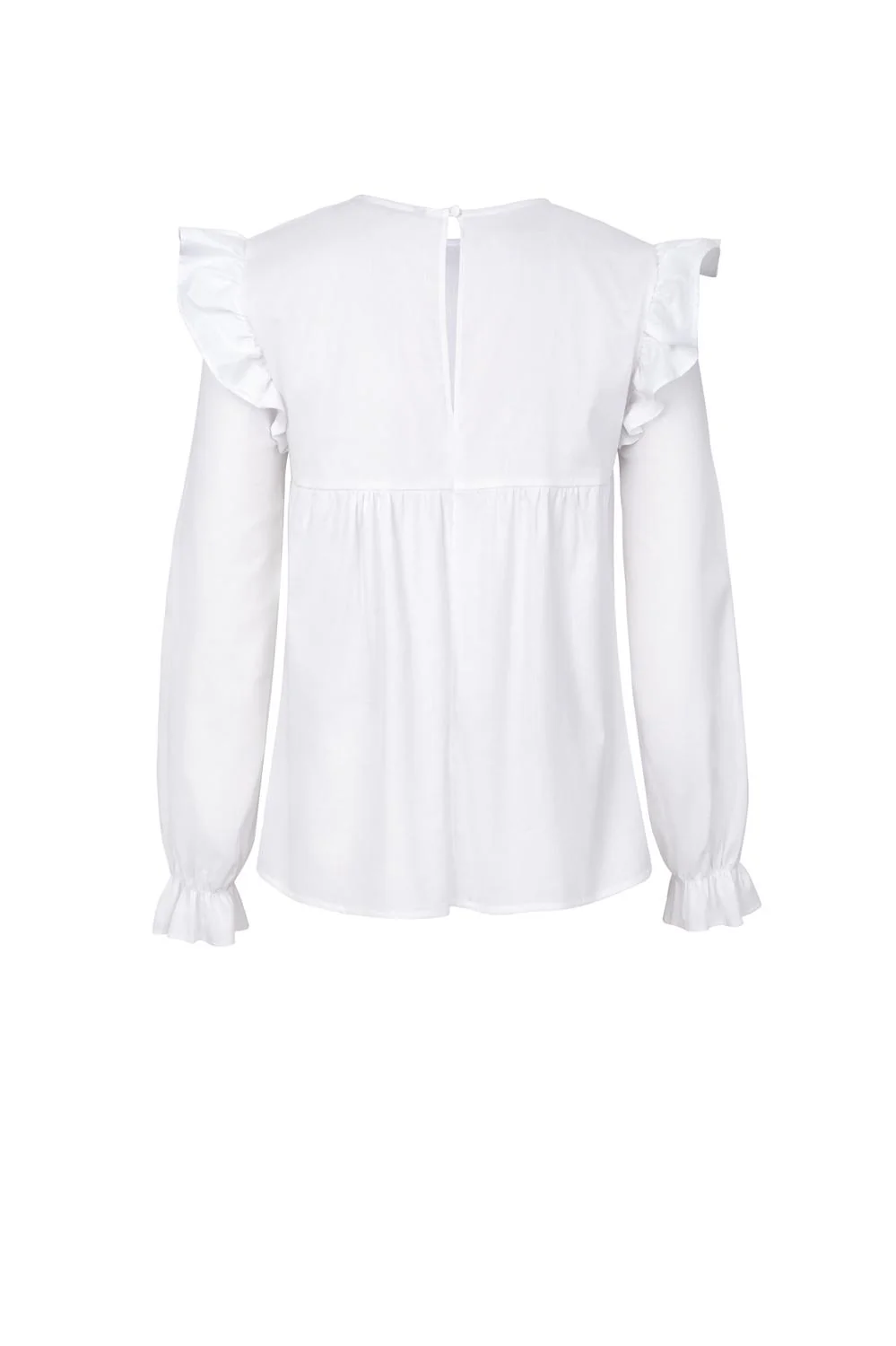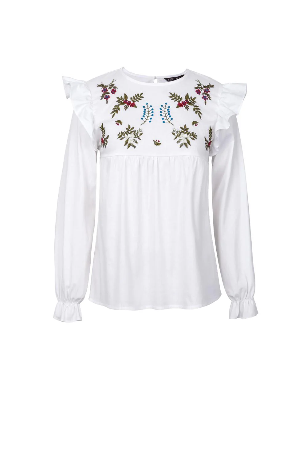 Blusa con cuello redondo, olán en sisas, bordado frontal, corte en bajo busto, mangas largas y elástico en puños.prod. # 27-2054