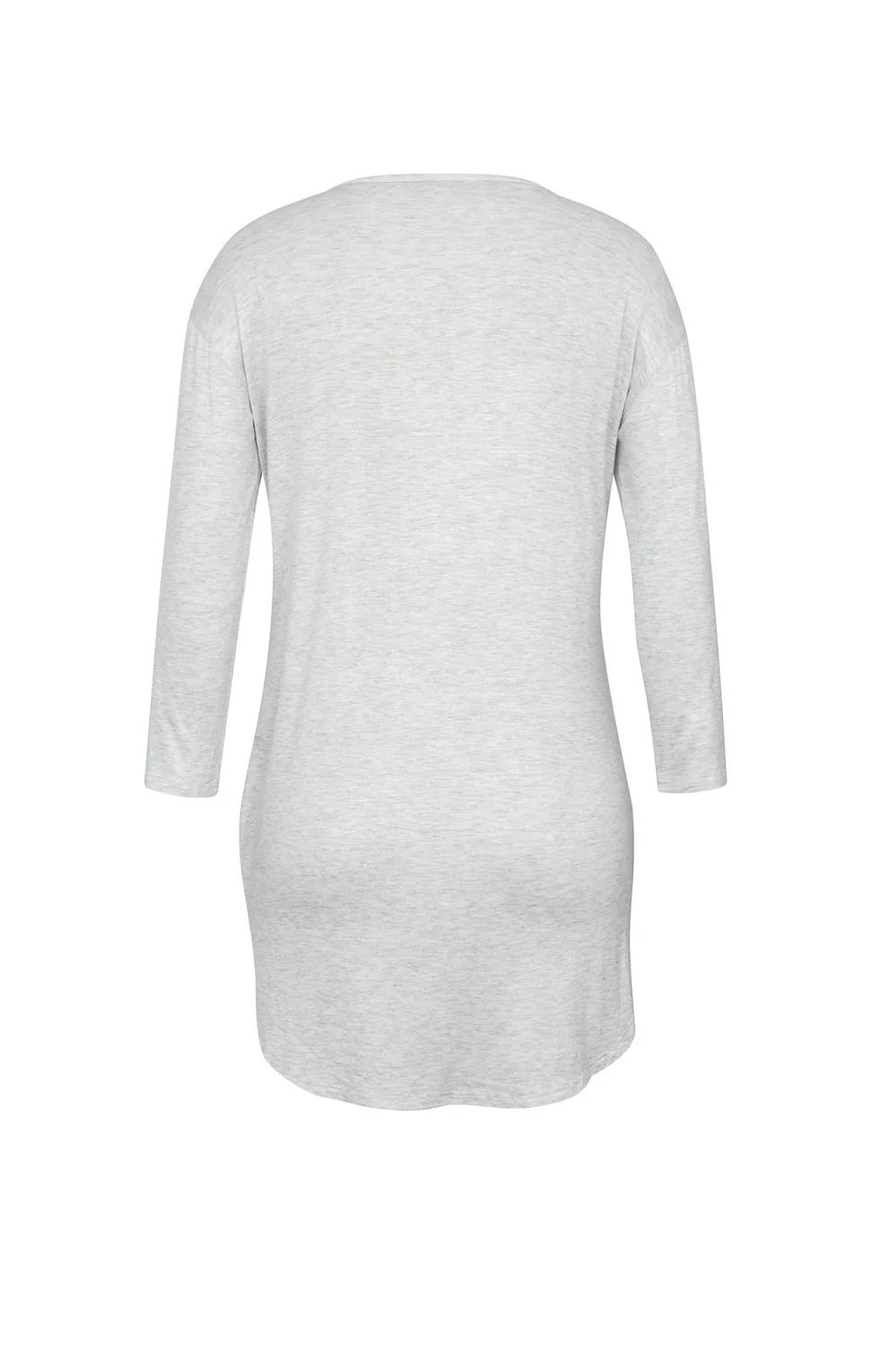 • Blusa larga con cuello redondo, mangas 3/4, ruedo asimétrico y estampado frontal.