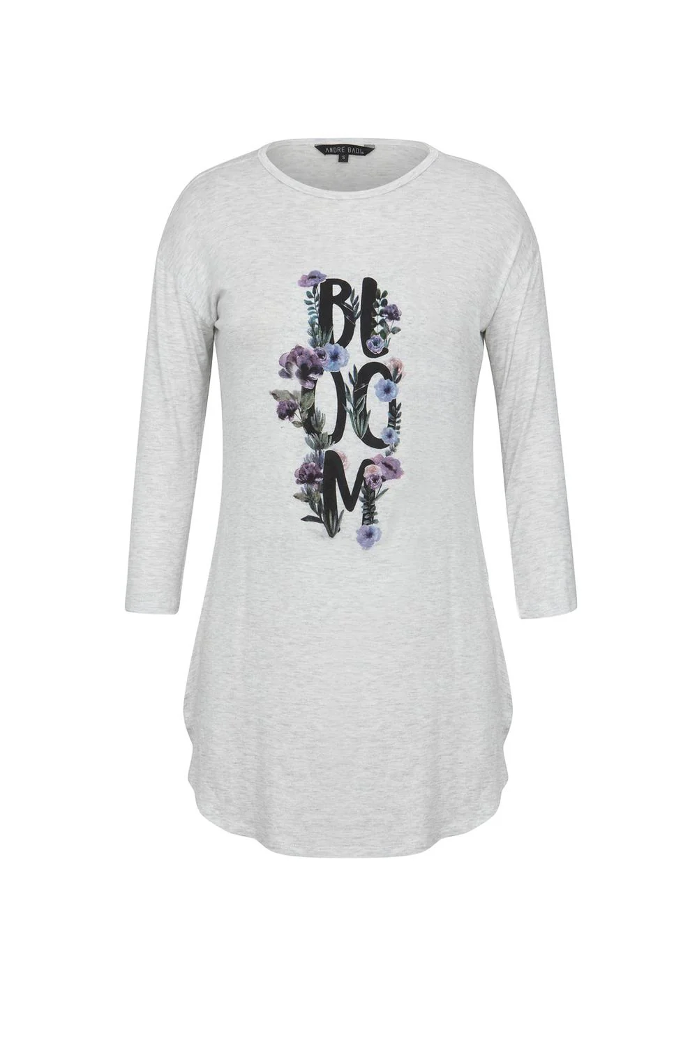 Blusa larga con cuello redondo, mangas 3/4, ruedo asimétrico y estampado frontal.