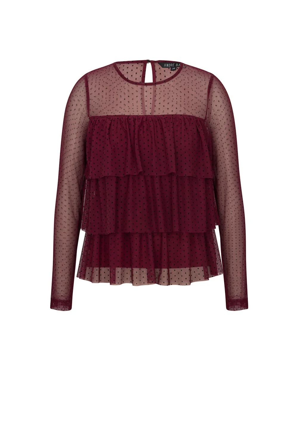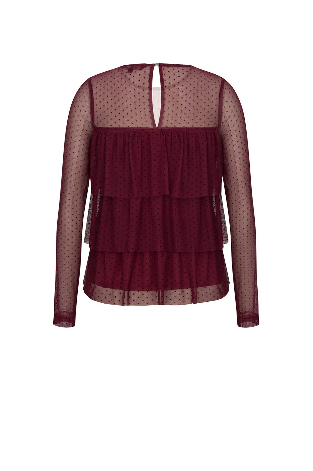 Blusa de mesh con escote redondo, múltiples olanes, transparecias y mangas largas.