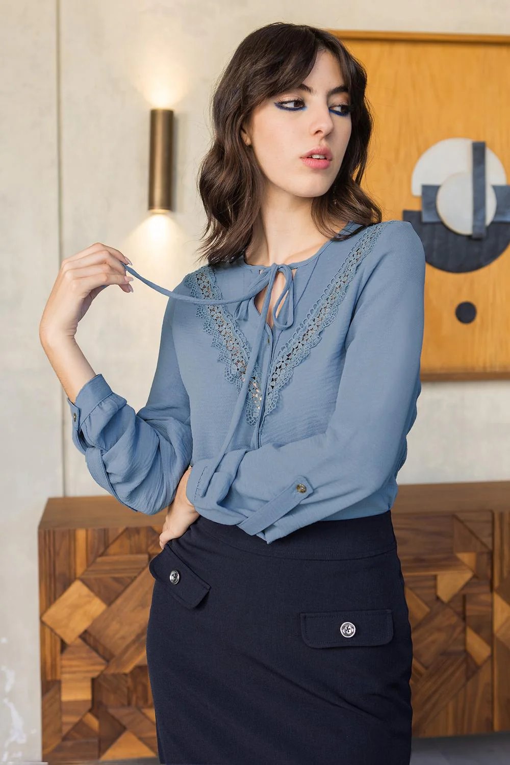 Blusa de escote redondo, abertura frontal con tiras, botonadura, aplicación decorativa que deja ver la piel, mangas largas con trabillas y elevadores. 27-2573