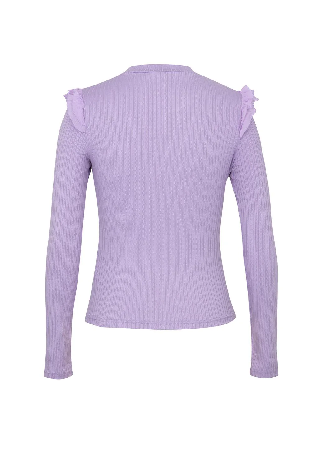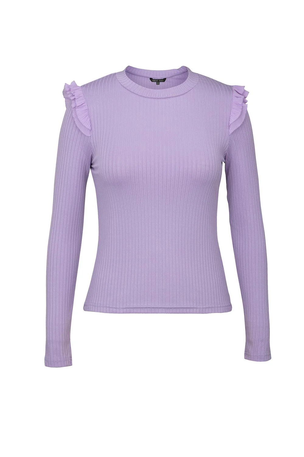 Blusa con escote redondo en combinación de materiales, mangas largas y olanes decorativos en hombros.