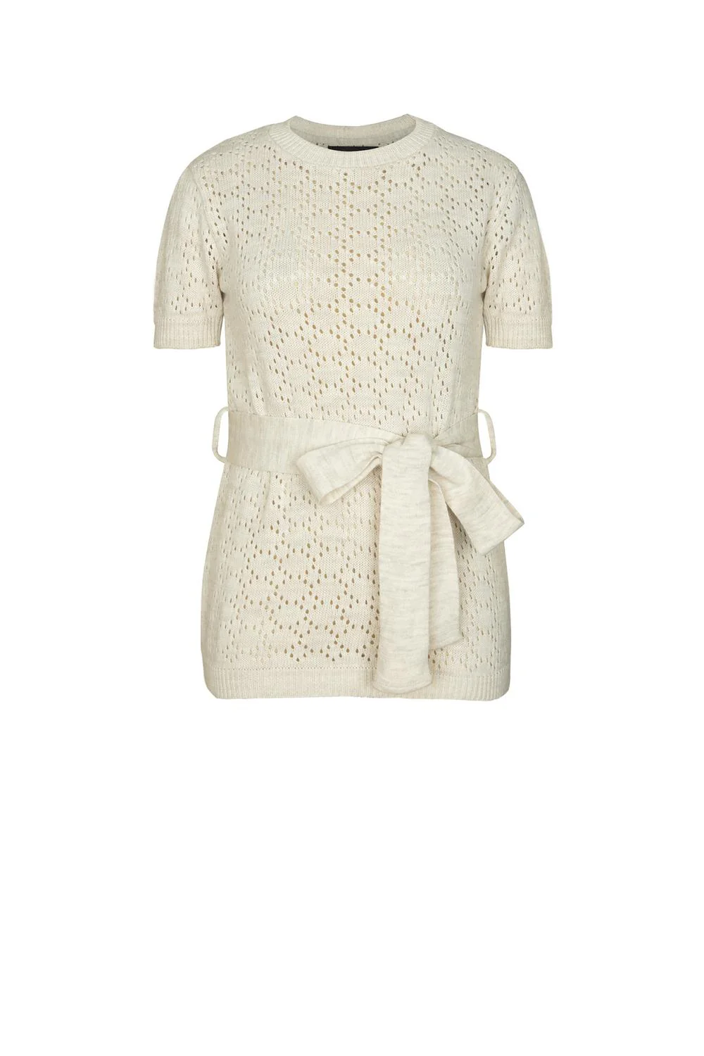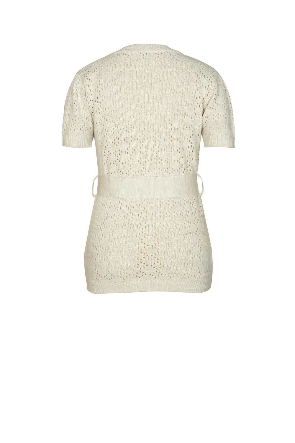 Blusa larga con tejido decorativo, escote redondo, plisado en copa de manga corta y lazo en cintura. 27-2638