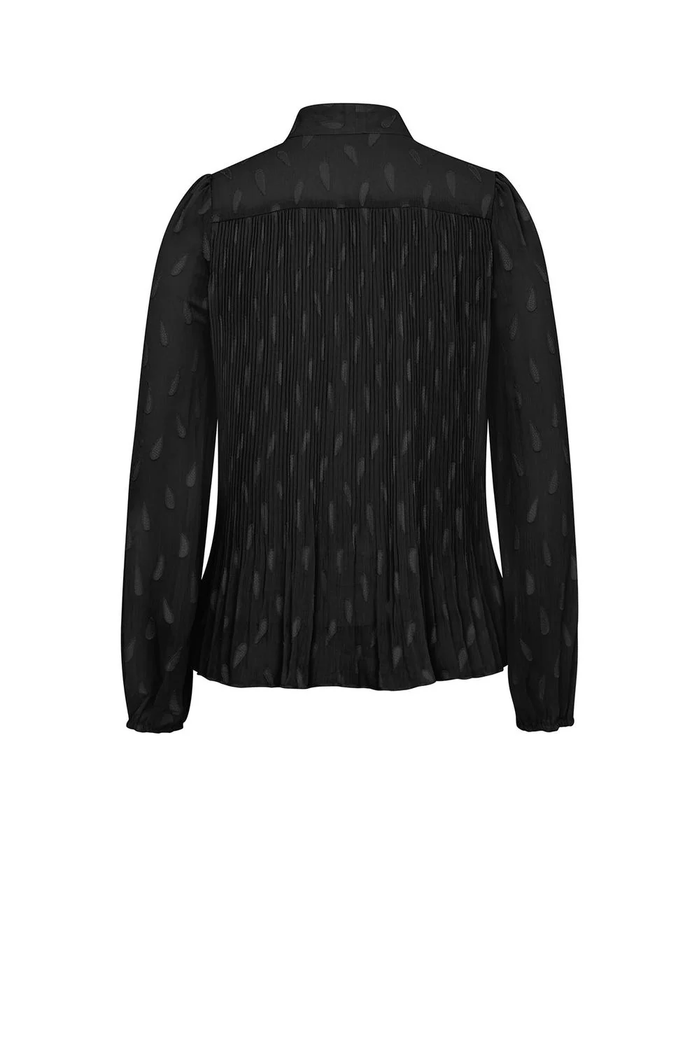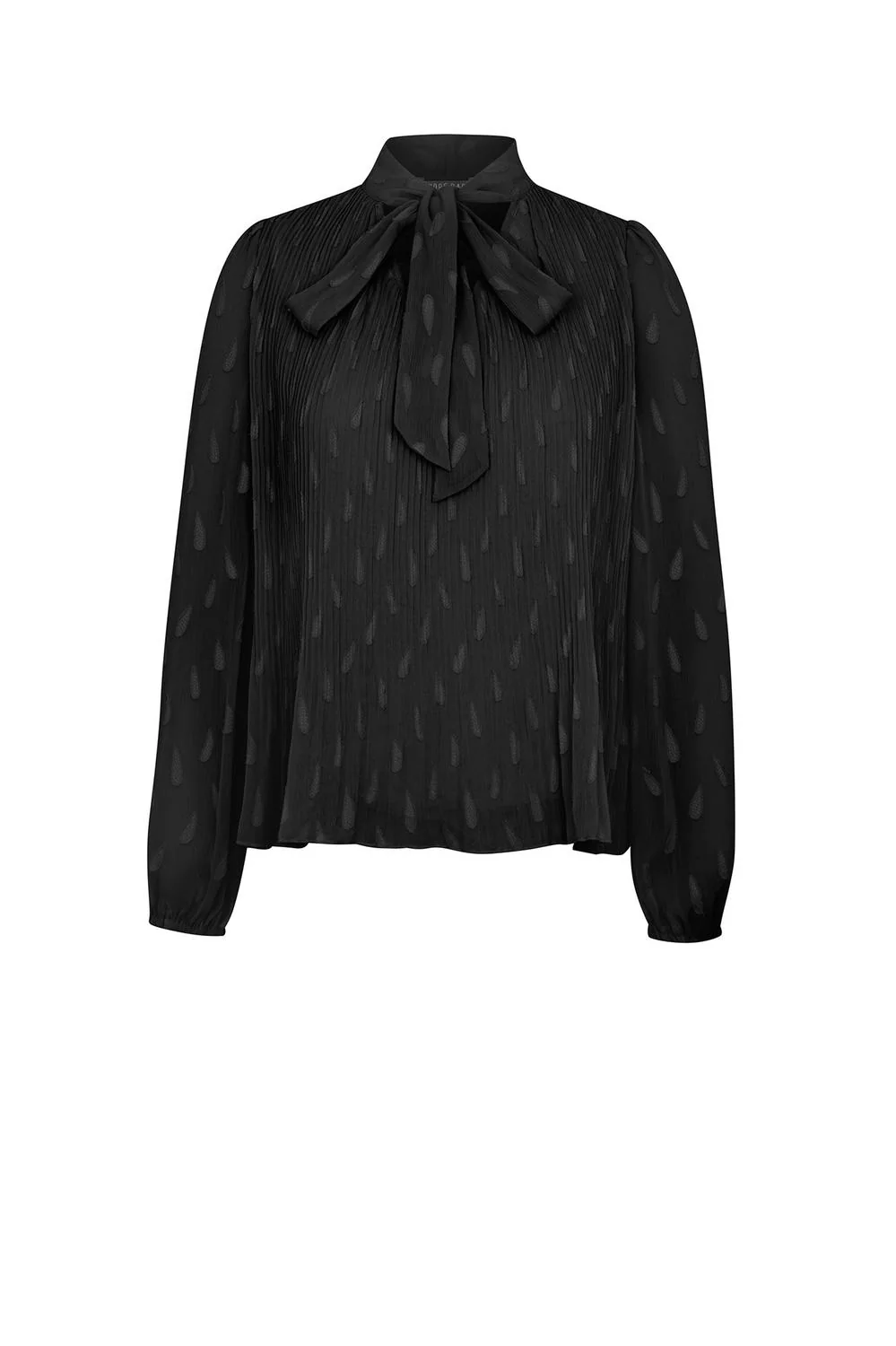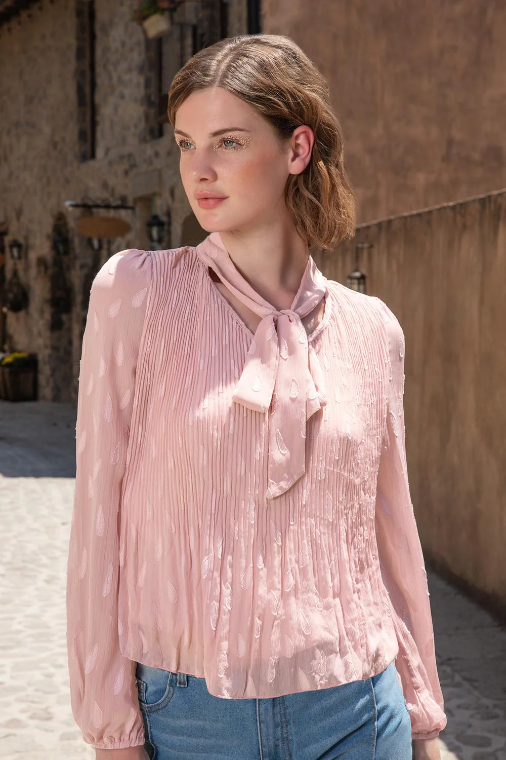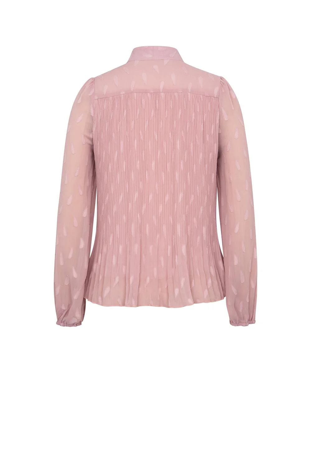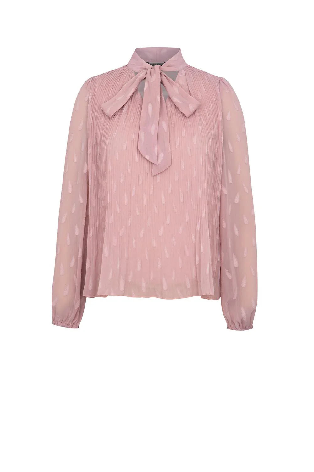 Blusa de tela texturizada con talle plisado, lazo decorativo en cuello y mangas largas con elástico en puños.
