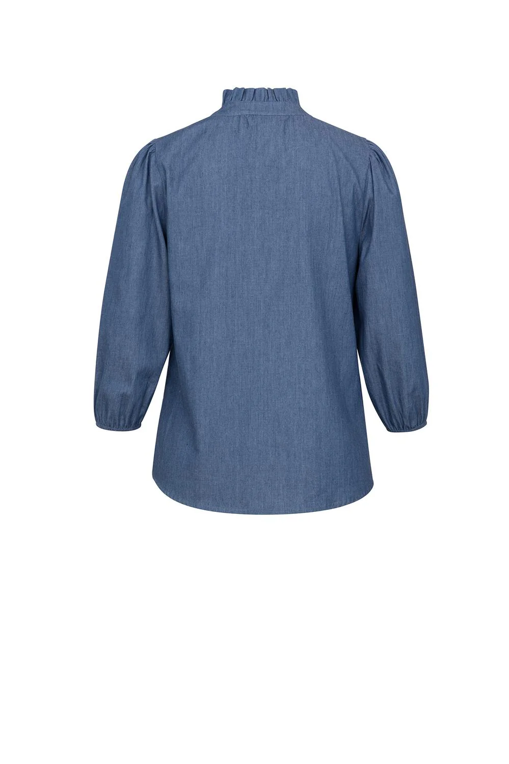 Blusa con olán en cuello, botonadura, mangas abullonadas 3/4, elástico en puños y bordado decorativo frontal. Código de producto 27-2473