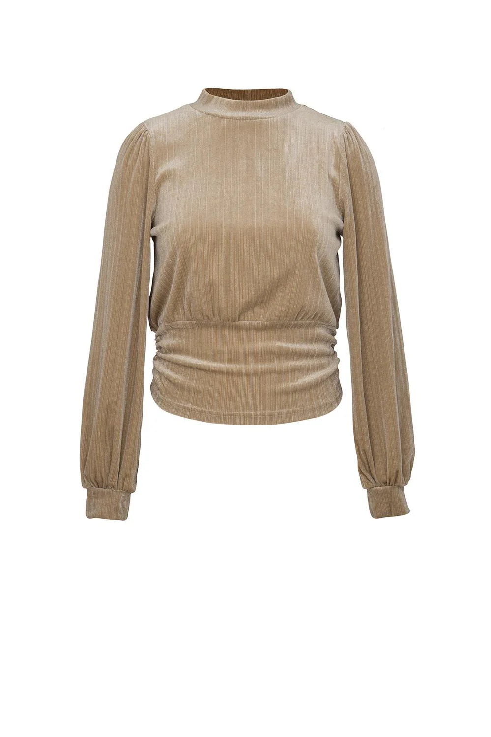 Blusa con cuello, textura aterciopelada, mangas largas, peto en cintura y abertura en espalda.