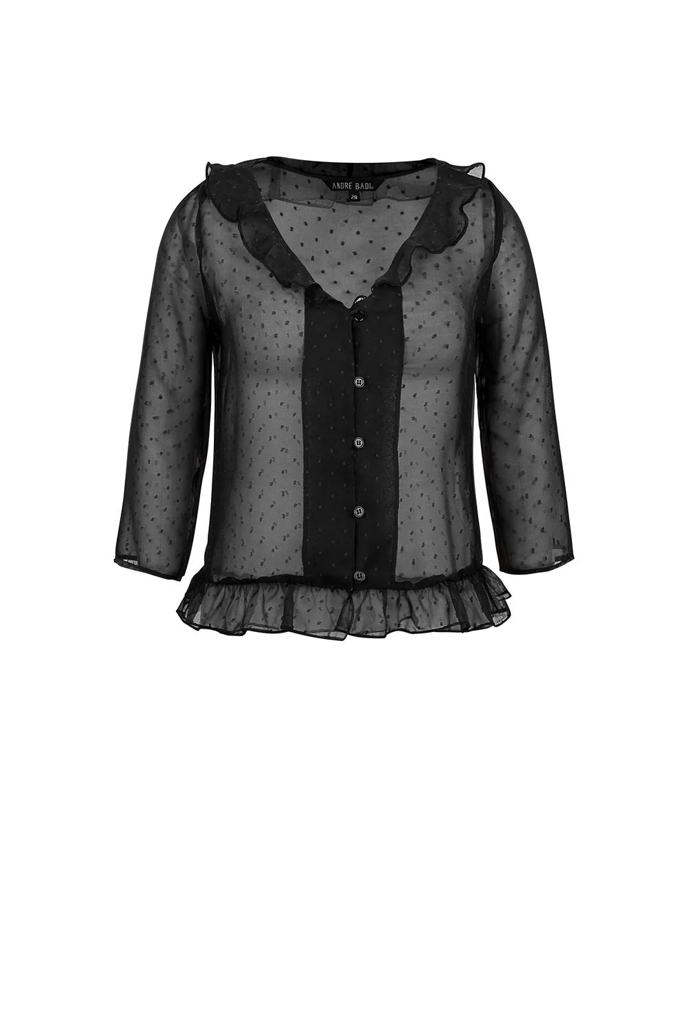 - Blusa con textura y trasparencia, fit regular, cuello amplio, botonadura frontal, mangas 3