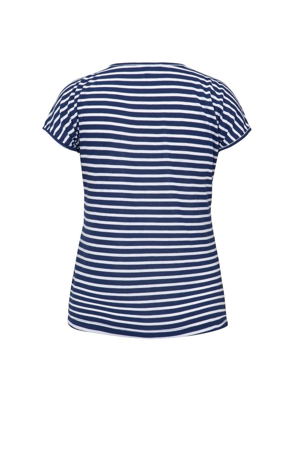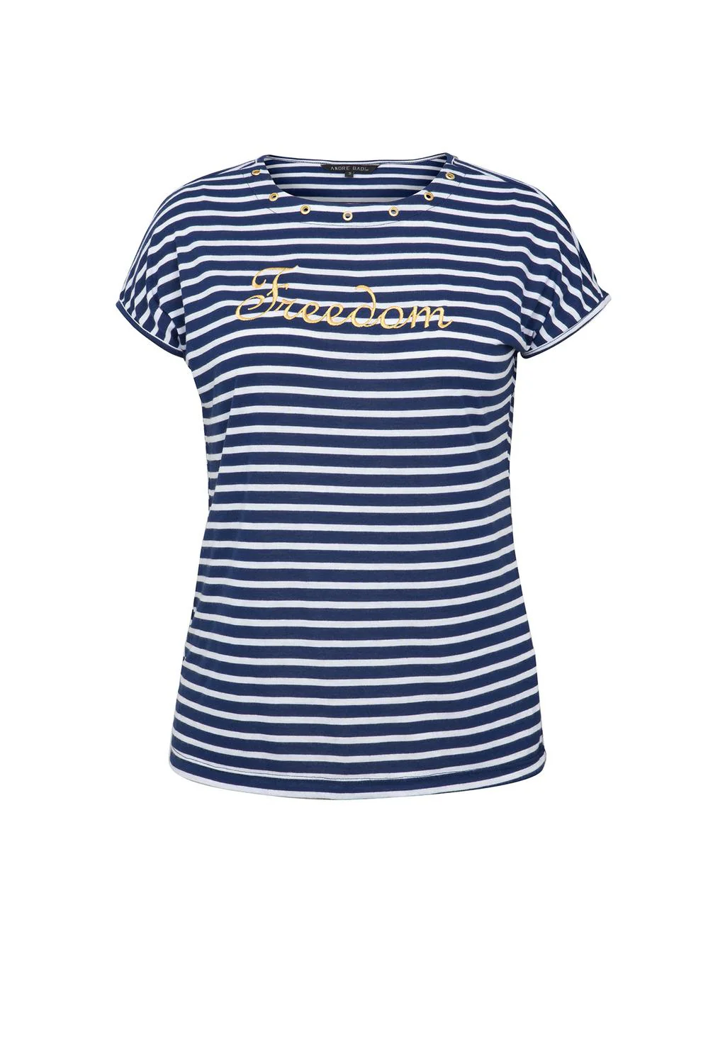 Blusa estampada a rayas con cuello redondo, ojillos decorativos, bordado frontal y mangas continuas.