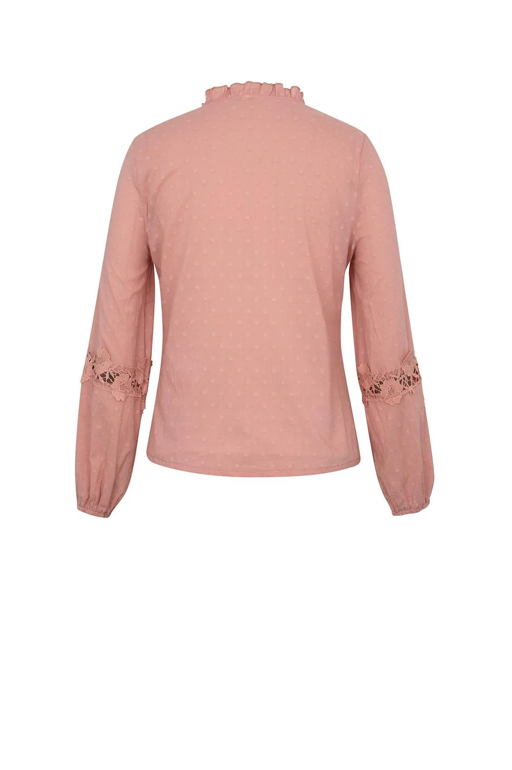 Blusa con escote redondo, olán decorativo, botonadura delantera, alforzas, aplicación de tira bordada, mangas largas y mini puño.